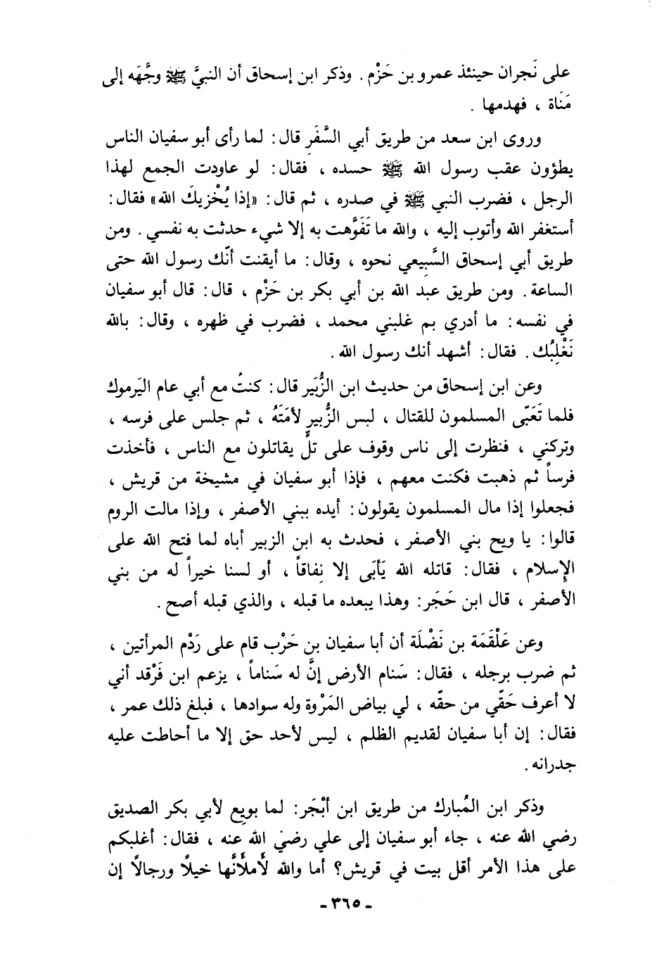وروى ابن سعد من طريق أبي السَّفَرِ قال: لما رأى أبو سفيان الناس يطؤون عقب رسول الله - صلى الله عليه وسلم - حسده، فقال: لو عاودت الجمع لهذا الرجل، فضرب النبي - صلى الله عليه وسلم - في صدره، ثم قال: "إذا يُخْزيكَ الله" فقال: أستغفر الله وأتوب إليه، والله ما تَفَوَّهت به إلا شيء حدثت به نفسي. ومن طريق أبي إسحاق السَّبِيعي نحوه، وقال: ما أيقنت أنك رسول الله حتى الساعة. ومن طريق عبد الله بن أبي بكر بن حَزْم، قال: قال أبو سفيان في نفسه: ما أدري بم غلبني محمَّد، فضرب في ظهره، وقال: بالله نَغْلِبُك. فقال: أشهد أنك رسول الله.