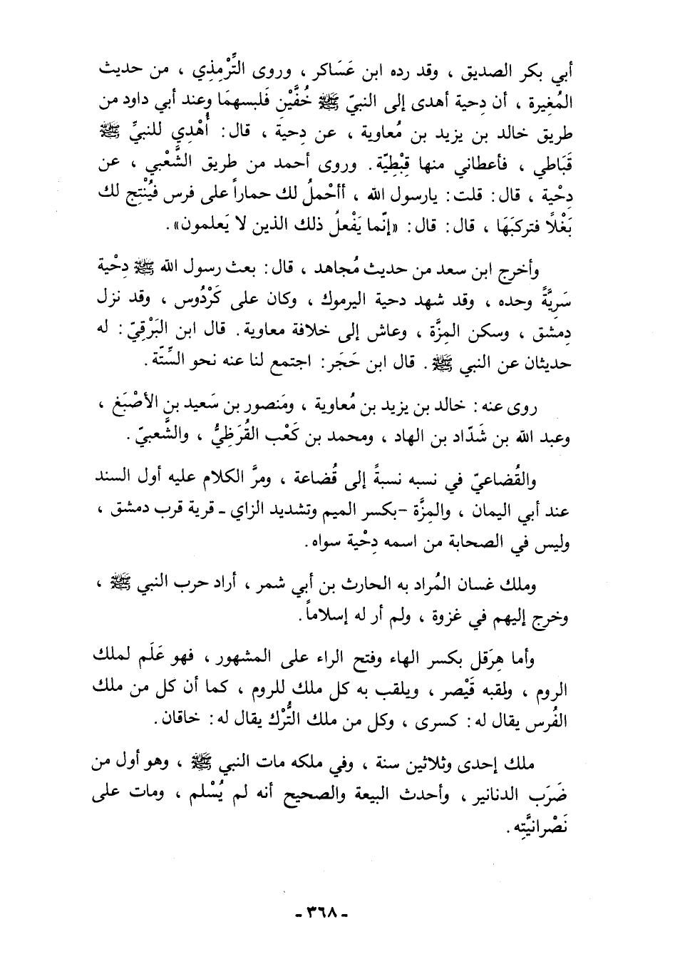 أبي بكر الصديق، وقد رده ابن عَسَاكر، وروى التِّرْمِذِي، من حديث المُغِيرة، أن دِحية أهدى إلى النبيّ - صلى الله عليه وسلم - خُفَّيْنِ فَلبسهمَا وعند أبي داود من طريق خالد بن يزيد بن مُعاوية، عن دِحية، قال: أُهْدِي للنبيِّ - صلى الله عليه وسلم - قَبَاطي، فأعطاني منها قِبْطِيّة. وروى أحمد من طريق الشَّعْبي، عن دِحْية، قال: قلت: يا رسول الله، أأحْملُ لك حمارًا على فرس فيُنْتِج لك بَغْلًا فتركبَهَا، قال: قال: "إنّما يَفْعلُ ذلك الذين لا يَعلمون".