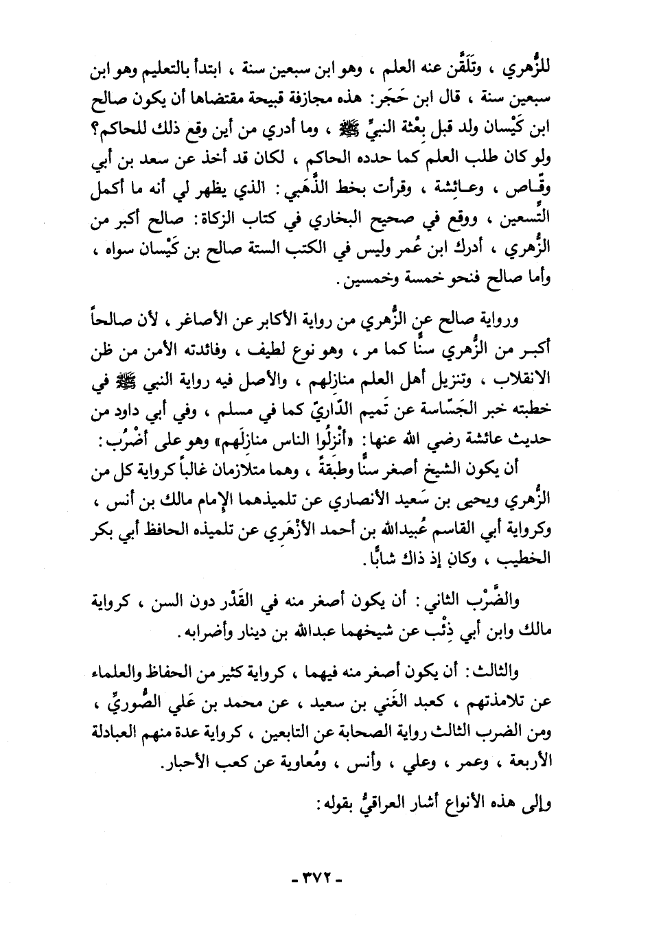 ورواية صالح عن الزُّهري من رواية الأكابر عن الأصاغر، لأن صالحًا أكبر من الزُّهري سنًّا كما مر، وهو نوع لطيف، وفائدته الأمن من ظن الانقلاب، وتنزيل أهل العلم منازِلهم، والأصل فيه رواية النبي - صلى الله عليه وسلم - في خطبته خبر الجَسّاسة عن تَميم الدّاريّ كما في مسلم، وفي أبي داود من حديث عائشة رضي الله عنها: "أنْزِلُوا الناس منازِلَهم" وهو على أضْرُب: أن يكون الشيخ أصغر سنًّا وطبَقةً، وهما متلازمان غالبًا كرواية كل من الزُّهري ويحيى بن سَعيد الأنصاري عن تلميذهما الإِمام مالك بن أنس، وكرواية أبي القاسم عُبيد الله بن أحمد الأزْهَرِي عن تلميذه الحافظ أبي بكر الخطيب، وكان إذ ذاك شابًّا.