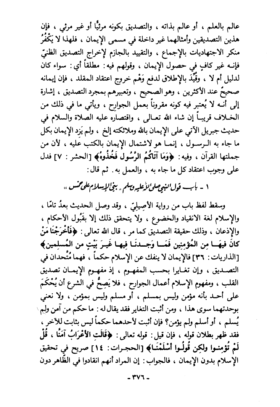 وسقط لفظ باب من رواية الأصِيلِيّ، وقد وصل الحديث بعدُ تامًا، والإِسلام لغة الانقياد والخضوع، ولا يتحقق ذلك إلا بقَبُول الأحكام، والإذعان، وذلك حقيقة التصديق كما مر، قال الله تعالى: {فَأَخْرَجْنَا مَنْ كَانَ فِيهَا مِنَ الْمُؤْمِنِينَ (35) فَمَا وَجَدْنَا فِيهَا غَيْرَ بَيْتٍ مِنَ الْمُسْلِمِينَ} [الذاريات: 35 - 36] فالإيمان لا ينفك عن الإِسلام حكمًا، فهما مُتَّحدان في التصديق، وإن تغايرا بحسب المفهوم، إذ مفهوم الإِيمان تصديق القلب، ومفهوم الإِسلام أعمال الجوارح، فلا يَصِحُّ في الشرع أن يُحْكَمَ على أحد بأنه مؤمن وليس بمسلم، أو مسلم وليس بمؤمن، ولا نعني بوحدتهما سوى هذا، ومن أثبت التغاير فقد يقال له: ما حكم من آمن ولم يُسلم، أو أسلم ولم يؤمن؟ فإن أثبت لأحدهما حكمًا ليس بثابت للآخر، فقد ظهر بطلان قوله، فإن قيل: قوله تعالى: {قَالَتِ الْأَعْرَابُ آمَنَّا قُلْ لَمْ تُؤْمِنُوا وَلَكِنْ قُولُوا أَسْلَمْنَا} [الحجرات: 14] صريح في تحقيق الإِسلام بدون الإِيمان، فالجواب: إن المراد أنهم انقادوا في الظّاهر دون