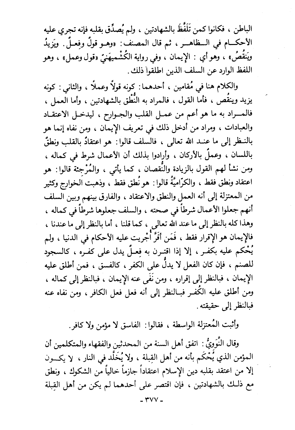 والكلام هنا في مُقامين، أحدهما: كونه قولًا وعملًا، والثاني: كونه يزيد وينقُص، فأما القول، فالمراد به النُّطْق بالشهادتين، وأما العمل، فالمراد به ما هو أعم من عمل القلب والجوارح، ليدخل الاعتقاد والعبادات، ومراد من أدخل ذلك في تعريف الإِيمان، ومن نفاه إنما هو بالنظر إلى ما عند الله تعالى، فالسلف قالوا: هو اعتقادٌ بالقلب ونطقٌ باللسان، وعملٌ بالأركان، وأرادوا بذلك أن الأعمال شرط في كماله، ومن نشأ لهم القول بالزيادة والنُّقصان، كما يأتي، والمُرْجِئة قالوا: هو اعتقاد ونطق فقط، والكرّاميَّةُ قالوا: هو نُطق فقط، وذهبت الخوارج وكثير من المعتزلة إلى أنه العمل والنطق والاعتقاد، والفارق بينهم وبين السلف أنهم جعلوا الأعمال شرطًا في صحته، والسلف جعلوها شرطًا في كماله، وهذا كله بالنظر إلى ما عند الله تعالى، كما قلنا، أما بالنظر إلى ما عندنا، فالإِيمان هو الإِقرار فقط، فَمَن أقَرَّ أُجْريت عليه الأحكام في الدنيا، ولم يُحْكم عليه بكفر، إلا إذا اقترن به فِعلٌ يدل على كفره، كالسجود للصنم، فإن كان الفعل لا يدلُّ على الكفر، كالفسق، فمن أطلق عليه الإِيمان، فبالنظر إلى إقراره، ومن نَفَى عنه الإِيمان، فبالنظر إلى كماله، ومن أطلق عليه الكُفر فبالنظر إلى أنه فعل فعل الكافر، ومن نفاه عنه فبالنظر إلى حقيقته.