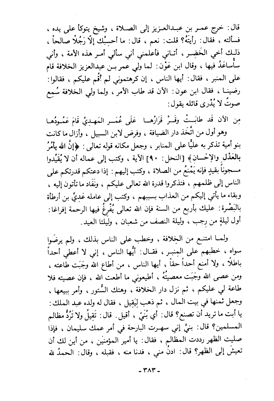 ولما امتنع من الخِلافة، وخطب على الناس بذلك، ولم يرضَوا سواه، خطبهم كلى المِنبر، فقال: أيُها الناس، إني لا أعطي أحدًا باطلًا، ولا أمنع أحدًا حقًا، أيها الناس، من أطاع الله وجَبَت طاعته، ومن عصى الله وجَبَت معصيتُهُ، أطيعوني ما أطعت الله، فإن عصيته فلا طاعة لي عليكم، ثم نزل دار الخلافة، وهتك السُّتور، وأمر ببيعها، وجعل ثمنها في بيت المال، ثم ذهب لِيَقِيل، فقال له ولده عبد الملك: يا أبت ما تريد أن تصنع؟ قال: أي بُنَيّ، أقيل. قال: تَقِيلُ ولا تَرُدُّ مظالم المسلمين؟ قال: بنيَّ إني سهرت البارحة في أمر عمك سليمان، فإذا صليت الظهر رددت المظالم، فقال: يا أمير المؤمنين، من أين لك أن تعيشَ إلى الظهر؟ قال: ادنُ مني، فدنا منه، فقبله، وقال: الحمدُ لله