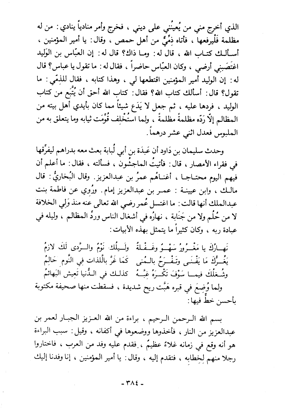 الذي أخرج مني من يُعينُني على ديني، فخرج وأمر مناديًا ينادي: من له مظلمة فَلْيرفعها، فأتاه ذِمِّيٌّ من أهل حمص، وقال: يا أمير المؤمنين، أسألك كتاب الله، قال له: وما ذاك؟ قال له: إن العبّاس بن الوَليد اغتَصَبنِي أرضي، وكان العبّاس حاضرًا، فقال له: ما تقول يا عباس؟ قال له: إن الوليد أمير المؤمنين اقتطعها لي، وهذا كتابه، فقال للذِمّي: ما تقول؟ قال: أسألك كتاب الله؟ فقال: كتاب الله أحق أن يُتَبَع من كتاب الوليد، فردها عليه، ثم جعل لا يَدَع شيئًا مما كان بأيدي أهل بيته من المظالم إلَّا رَدّه مظلمةً مظلمةً، ولما استُخْلِف قُوِّمَت ثيابه وما يتعلق به من الملبوس فعدل اثني عشر درهمًا.