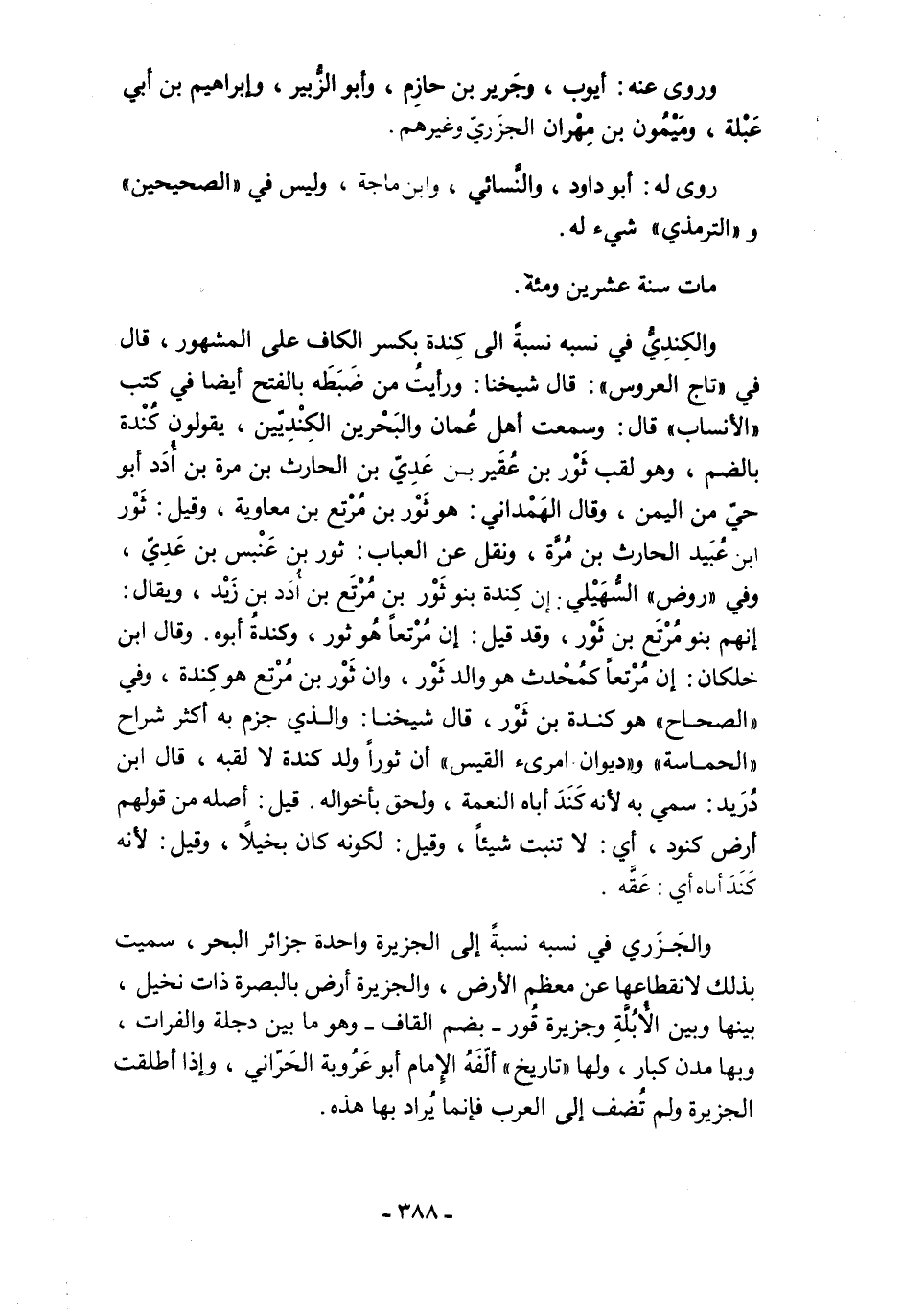 والجَزَري في نسبه نسبةً إلى الجزيرة واحدة جزائر البحر، سميت بذلك لانقطاعها عن معظم الأرض، والجزيرة أرض بالبصرة ذات نخيل، بينها وبين الأُبُلَّةِ وجزيرة قُور -بضم القاف- وهو ما بين دجلة والفرات، وبها مدن كبار، ولها "تاريخ" ألّفَهُ الإِمام أبو عَرُوبة الحَرّاني، وإذا أطلقت الجزيرة ولم تُضف إلى العرب فإنما يُراد بها هذه.