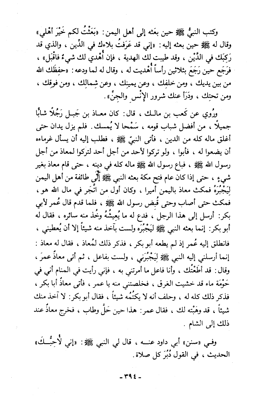 وكتب النبيُّ - صلى الله عليه وسلم - وحين بعَثه إلى أهل اليمن: "بَعَثْتُ لكم خَيْرَ أهْلي" وقال له - صلى الله عليه وسلم - حين بعثه إليه: "إنىِ قد عَرَفتُ بلاءك في الدِّين، والذي قد رَكِبَك في الدَّيْن، وقد طيبت لك الهدية، فإن أُهْدي لك شيءٌ فاقْبَل"، فرَجَع حين رَجَعَ بثلاثين رأسًا أُهْديت له، وقال له لما ودعه: "حفِظَك الله من بين يديك، ومن خلفِك، وعن يمينِك، وعن شِمالِك، ومن فوقِك، ومن تحتِك، ودَرَأ عنك شرور الإِنْسِ والجِنِّ".