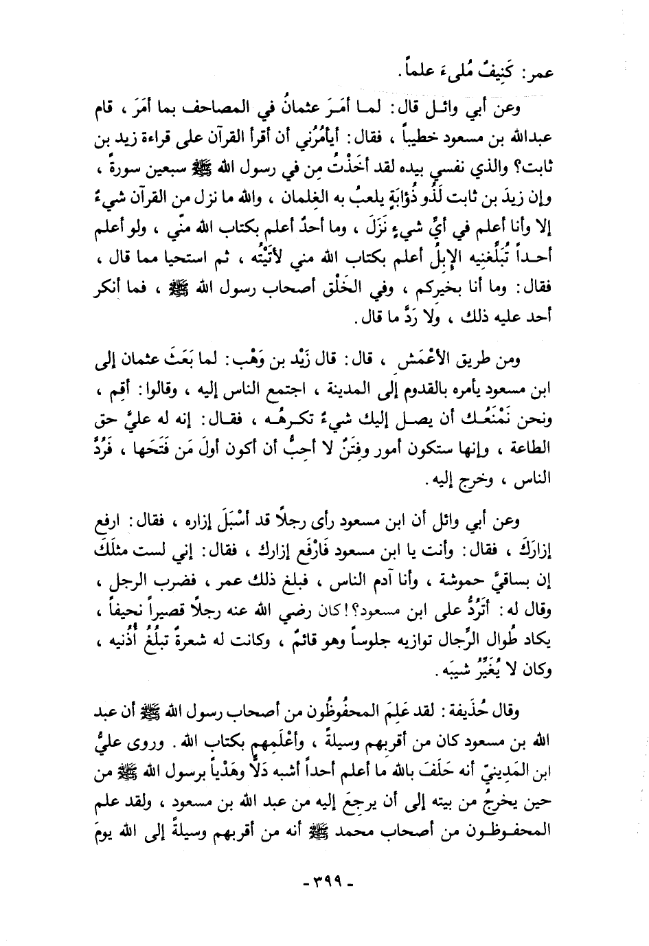 وعن أبي وائل قال: لما أمَرَ عثمانُ في المصاحف بما أمَرَ، قام عبد الله بن مسعود خطيبًا، فقال: أيأمُرُني أن أقرأ القرآن على قراءة زيد بن ثابت؟ والذي نفسي بيده لقد أخَذْتُ مِن في رسول الله - صلى الله عليه وسلم - سبعين سورةً، وإن زيدَ بن ثابت لَذُو ذُؤابَةٍ يلعبُ به الغِلمان، والله ما نزل من القرآن شيءٌ إلا وأنا أعلم في أيِّ شيءٍ نَزَلَ، وما أحدٌ أعلم بكتاب الله منّي، ولو أعلم أحدًا تُبَلِّغنِيه الإِبِلُ أعلم بكتاب الله مني لأتَيْتُه، ثم استحيا مما قال، فقال: وما أنا بخيرِكم، وفي الخَلْق أصحاب رسول الله - صلى الله عليه وسلم -، فما أنكر أحد عليه ذلك، وَلا رَدَّ ما قال.