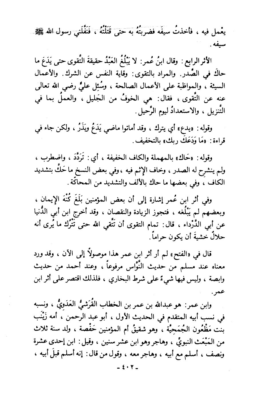 الأثر الرابع: وقال ابنُ عُمر: لا يَبْلُغُ العَبْدُ حقيقةَ التَّقوى حتى يَدَعَ ما حاكَ في الصَّدر. والمراد بالتقوى: وقاية النفس عن الشرك. والأعمال السيئة، والمواظبة على الأعمال الصالحة، وسُئِل عليٌّ رضي الله تعالى عنه عن التَّقوى، فقال: هي الخوفُ من الجَليل، والعملُ بما في التنزيل، والاستعدادُ ليوم الرَّحيل.