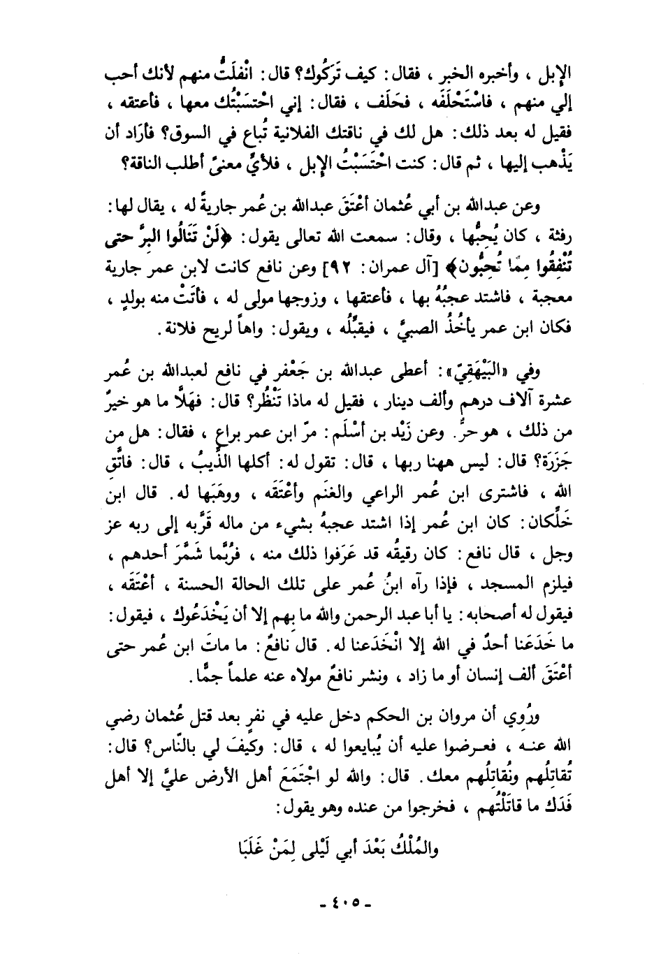 وعن عبد الله بن أبي عُثمان أعْتَقَ عبد الله بن عُمر جاريةً له، يقال لها: رفثة، كان يُحِبُّها، وقال: سمعت الله تعالى يقول: {لَنْ تَنَالُوا الْبِرَّ حَتَّى تُنْفِقُوا مِمَّا تُحِبُّونَ} [آل عمران: 92] وعن نافع كانت لابن عمر جارية معجبة، فاشتد عجبُهُ بها، فأعتقها، وزوجها مولى له، فأتَتْ منه بولدٍ، فكان ابن عمر يأخُذُ الصبيَّ، فيقبِّلُه، ويقول: واهًا لريح فلانة.