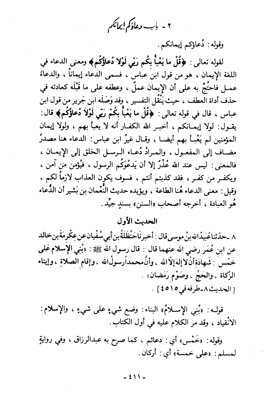 لقوله تعالى: {قُلْ مَا يَعْبَأُ بِكُمْ رَبِّي لَوْلَا دُعَاؤُكُمْ} ومعنى الدعاء في اللغة الإِيمان، هو من قول ابن عباس، فسمى الدعاء إيمانًا، والدعاءُ عمل فاحتُجَّ به على أن الإِيمان عملٌ، وعطفه على ما قَبْلَه كعادته في حذف أداة العطف، حيث يَنْقُل التفسير، وقد وَصَلَه ابن جَرير من قول ابن عباس، قال في قوله تعالى: {قُلْ مَا يَعْبَأُ بِكُمْ رَبِّي لَوْلَا دُعَاؤُكُمْ} قال: يقول: لولا إيمانكم، أخبر الله الكفار أَنه لا يعبأ بهم، ولولا إيمان المؤمنين لم يَعْبأ بهم أيضًا، وقال غيرُ ابن عباس: الدعاء هنا مصدرٌ مضاف إلى المفعول، والمرادُ دُعاء الرسل الخلق إلى الإِيمان، فالمعنى: ليس عند الله عُذْرٌ إلا أن يَدعُوَكُم الرسول، فيُؤمن من آمن، ويكفر من كفر، فقد كذبتم أنتم، فسوف يكون العذاب لازمًا لكم، وقيل: معنى الدعاء هُنا الطاعة، ويؤيده حديث النُّعْمان بن بَشير أن الدُّعاء هُو العبادة، أخرجه أصحاب "السنن" بسندٍ جيِّد.