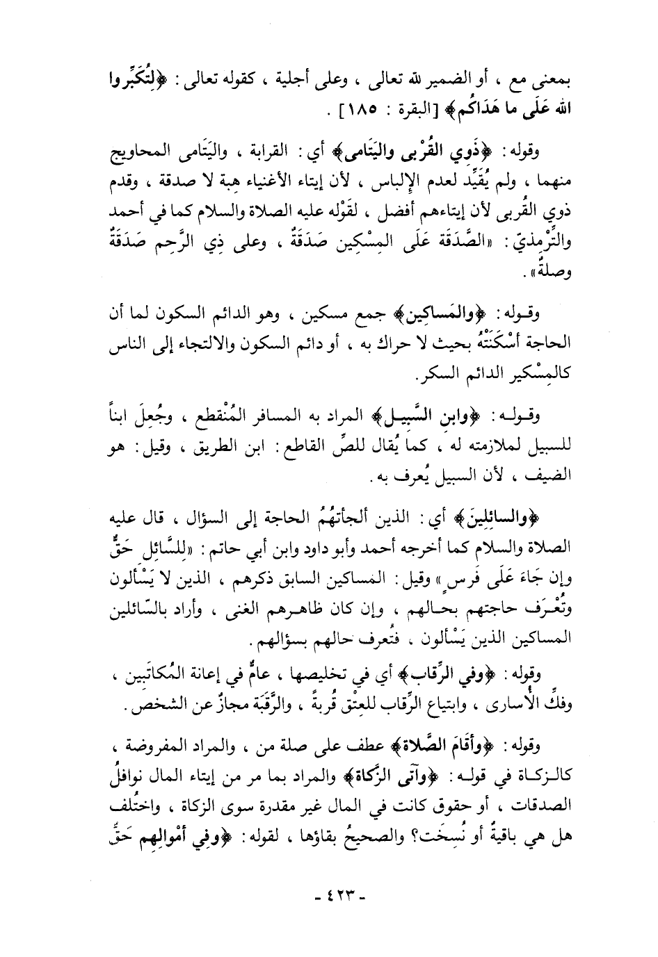 وقوله: {وَابْنَ السَّبِيلِ} المراد به المسافر المُنْقطع، وجُعِلَ ابنًا للسبيل لملازمته له، كمَا يُقال للصِّ القاطع: ابن الطريق، وقيل: هو الضيف، لأن السبيل يُعرف به.