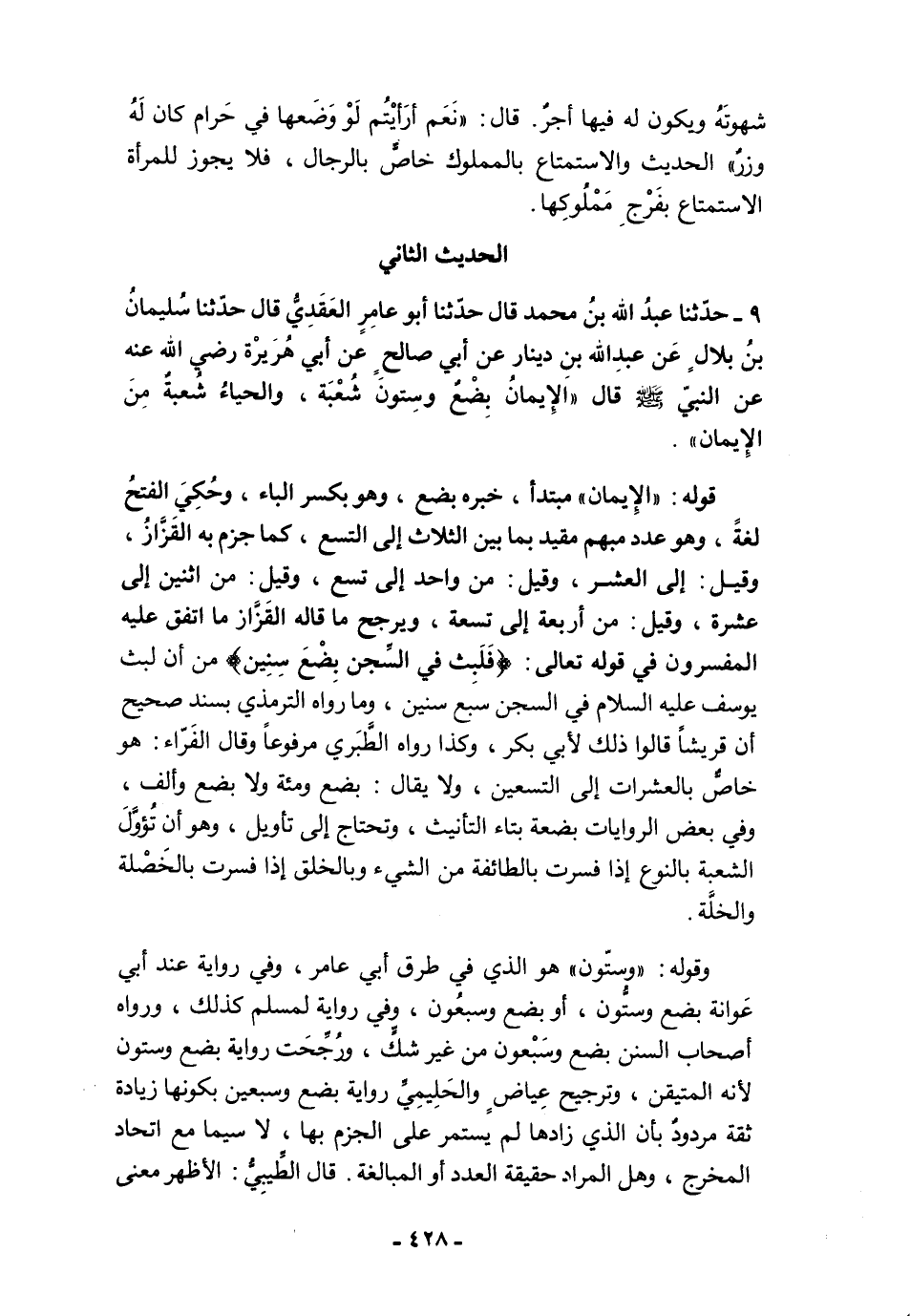 9 - حَدَّثَنَا عَبْدُ اللَّهِ بْنُ مُحَمَّدٍ قَالَ حَدَّثَنَا أَبُو عَامِرٍ الْعَقَدِيُّ قَالَ حَدَّثَنَا سُلَيْمَانُ بْنُ بِلاَلٍ عَنْ عَبْدِ اللَّهِ بْنِ دِينَارٍ عَنْ أَبِي صَالِحٍ عَنْ أَبِي هُرَيْرَةَ - رضي الله عنه - عَنِ النَّبِيِّ - صلى الله عليه وسلم - قَالَ «الإِيمَانُ بِضْعٌ وَسِتُّونَ شُعْبَةً، وَالْحَيَاءُ شُعْبَةٌ مِنَ الإِيمَانِ».