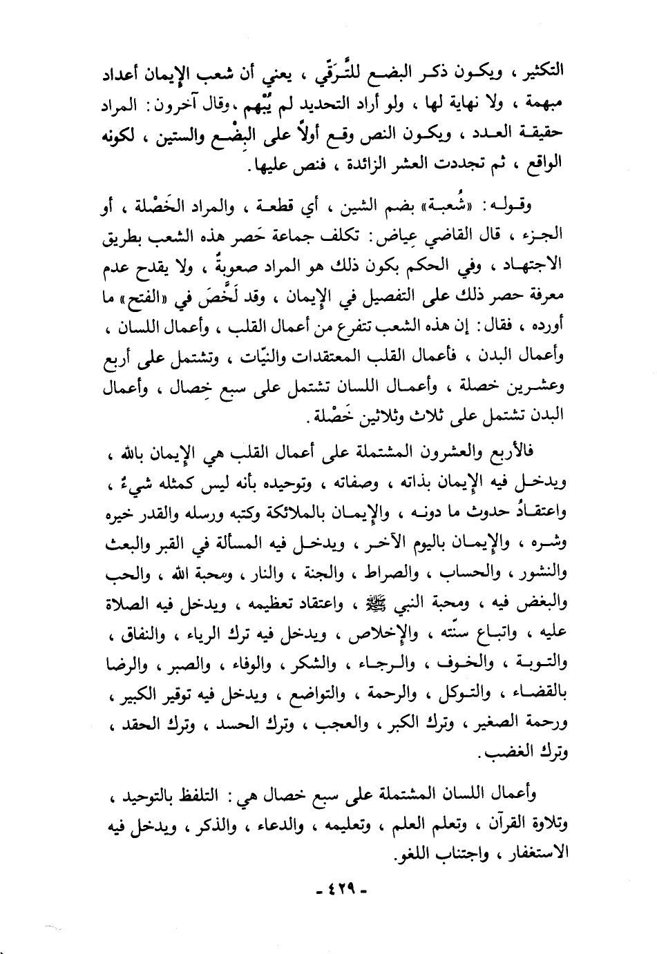 وقوله: "شُعبة" بضم الشين، أي قطعة، والمراد الخَصْلة، أو الجزء، قال القاضي عِياض: تكلف جماعة حَصر هذه الشعب بطريق الاجتهاد، وفي الحكم يكون ذلك هو المراد صعوبةٌ، ولا يقدح عدم معرفة حصر ذلك على التفصيل في الإِيمان، وقد لَخَّصَ في "الفتح" ما أورده، فقال: إن هذه الشعب تتفرع من أعمال القلب، وأعمال اللسان، وأعمال البدن، فأعمال القلب المعتقدات والنيّات، وتشتمل على أربع وعشرين خصلة، وأعمال اللسان تشتمل على سبع خِصال، وأعمال البدن تشتمل على ثلاث وثلاثين خَصْلة.