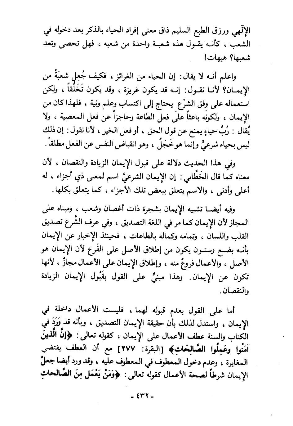 واعلم أنه لا يقال: إن الحياء من الغرائز، فكيف جُعِل شعبَةً من الإِيمان؟ لأنا نقول: إنه قد يكون غريزة، وقد يكون تَخَلُّقًا، ولكن استعماله على وِفق الشرْعِ يحتاج إلى اكتساب وعلم ونية، فلهذا كان من الإِيمان، ولكونه باعثًا على فعل الطاعة وحاجزًا عن فعل المعصية، ولا يُقال: رُبَّ حياءٍ يمنع عن قول الحق، أو فعل الخير، لأنا نقول: إن ذلك ليس بحياء شرعيٍّ وإنما هو خَجَلٌ، وهو انقباض النفس عن الفعل مطلقًا.