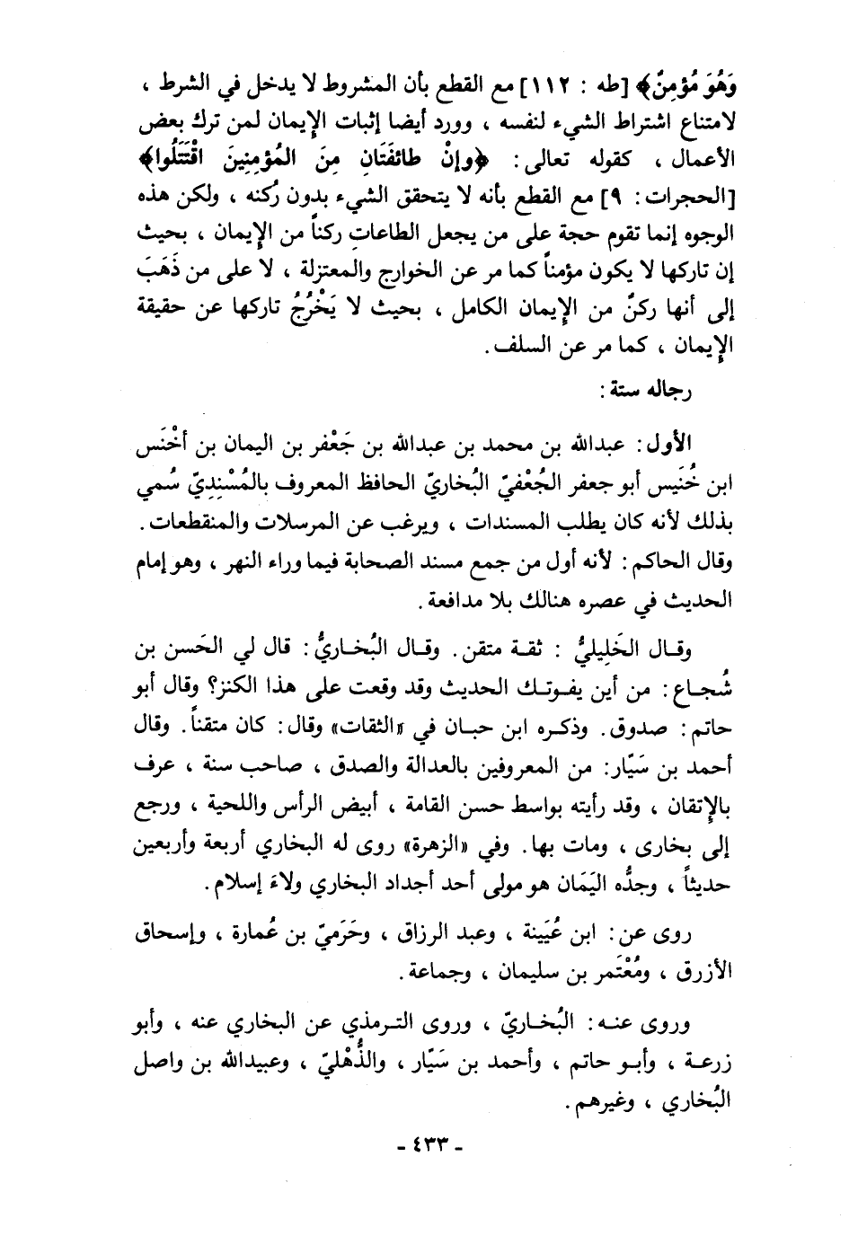 وَهُوَ مُؤْمِنٌ} [طه: 112] مع القطع بأن المشروط لا يدخل في الشرط، لامتناع اشتراط الشيء لنفسه، وورد أيضًا إثبات الإِيمان لمن ترك بعض الأعمال، كقوله تعالى: {وَإِنْ طَائِفَتَانِ مِنَ الْمُؤْمِنِينَ اقْتَتَلُوا} [الحجرات: 9] مع القطع بأنه لا يتحقق الشيء بدون رُكنه، ولكن هذه الوجوه إنما تقوم حجة على من يجعل الطاعاتِ ركنًا من الإِيمان، بحيث إن تاركها لا يكون مؤمنًا كما مر عن الخوارج والمعتزلة، لا على من ذَهَبَ إلى أنها ركن من الإِيمان الكامل، بحيث لا يَخْرُجُ تاركها عن حقيقة الإِيمان، كما مر عن السلف.