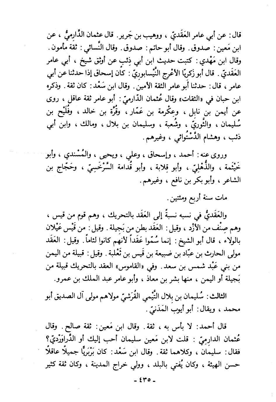 قال: عن أبي عامر العَقَديّ، ووهيب بن جَرير. قال عثمان الدَّارِميُّ، عن ابن مَعين: صدوق. وقال أبو حاتم: صدوق. وقال النَّسائي: ثقة مأمون.