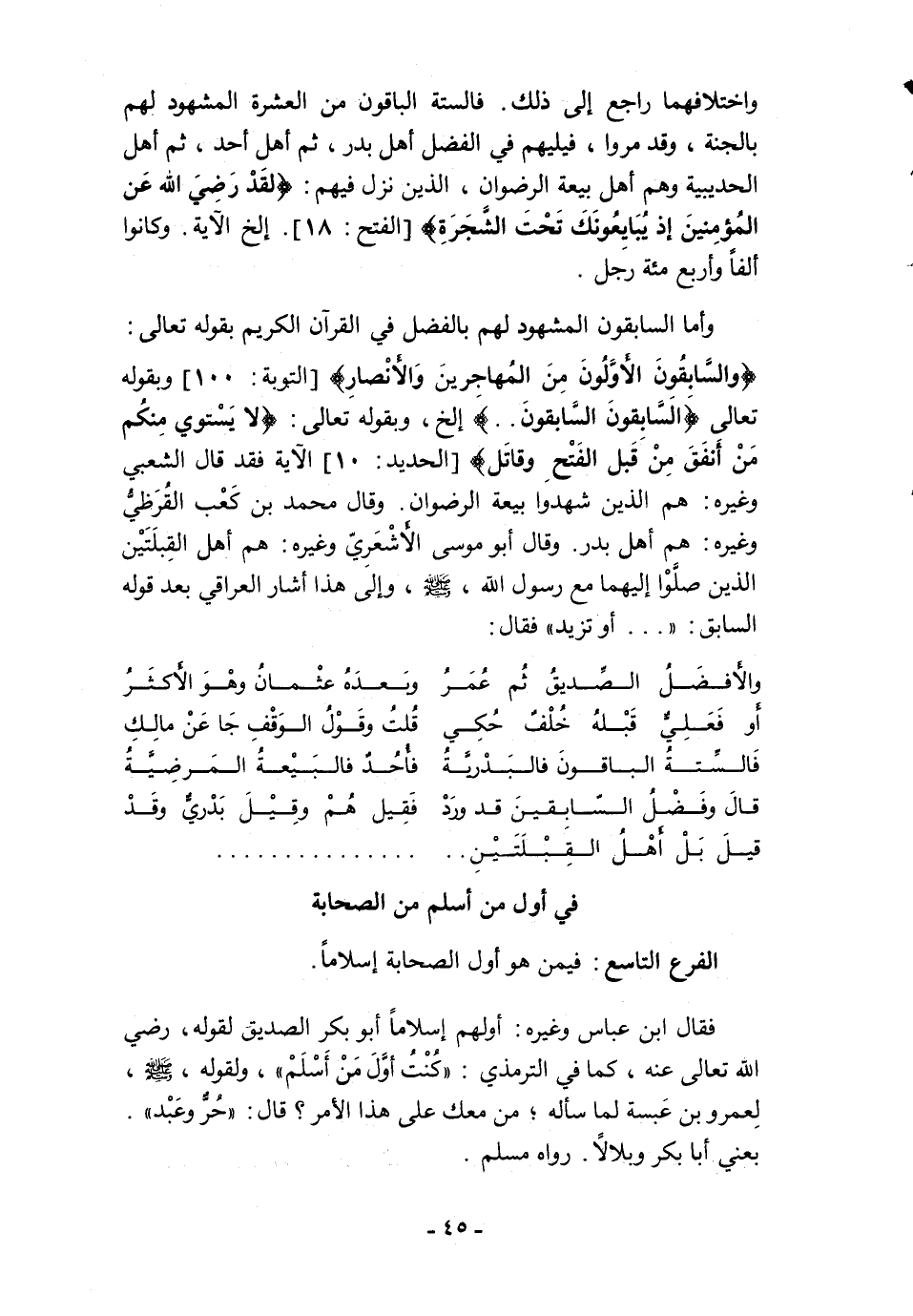 قالَ وفَضْلُ السّابقينَ قد ورَدْ ... فَقِيل هُمْ وقِيْلَ بَدْريٌّ وقَدْ