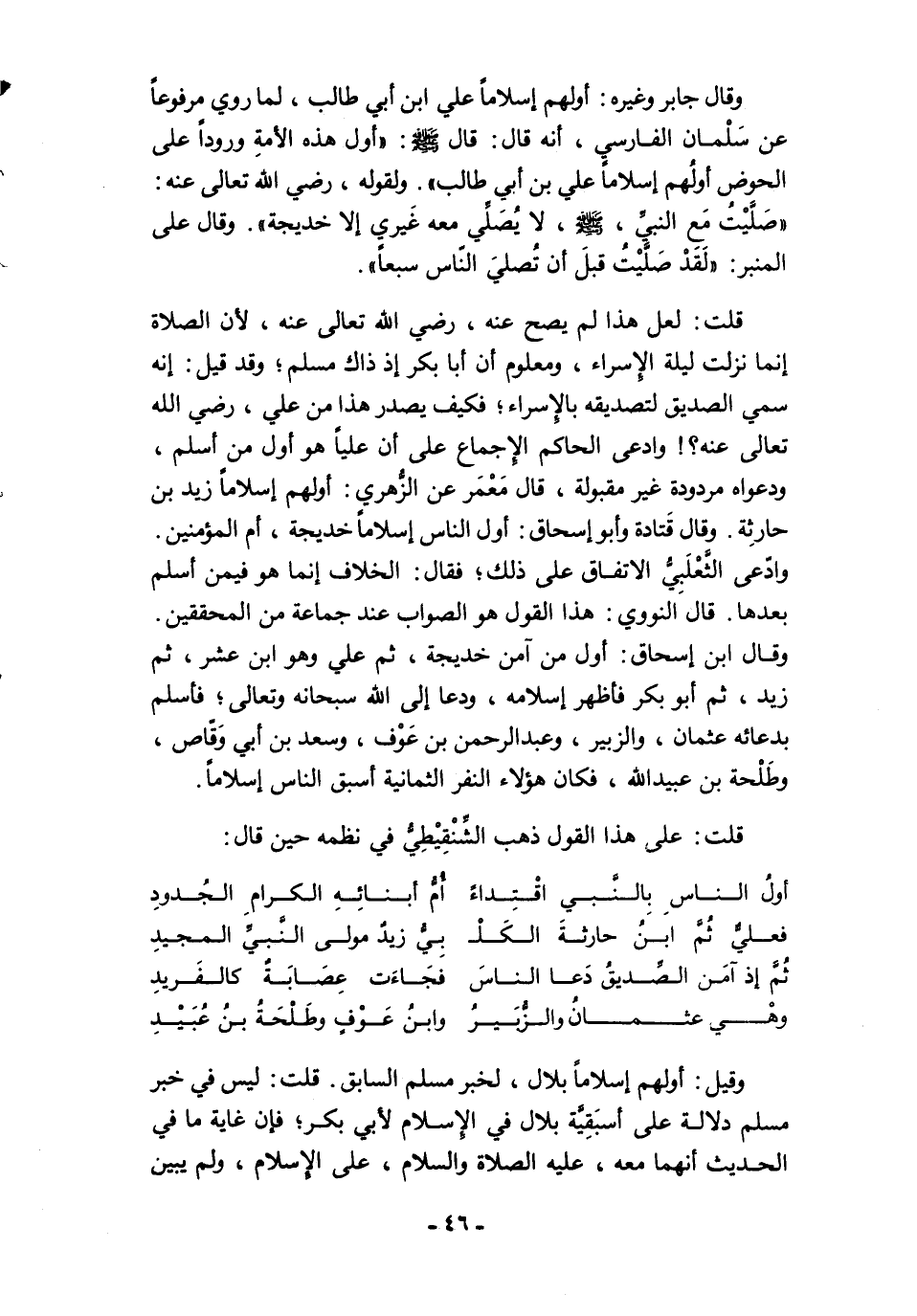 قلت: لعل هذا لم يصح عنه، رضي الله تعالى عنه، لأن الصلاة إنما نزلت ليلة الإسراء، ومعلوم أن أبا بكر إذ ذاك مسلم؛ وقد قيل: إنه سمي الصديق لتصديقه بالإسراء؛ فكيف يصدر هذا من علي، رضي الله تعالى عنه؟! وادعى الحاكم الإجماع على أن عليًا هو أول من أسلم، ودعواه مردودة غير مقبولة، قال مَعْمَر عن الزُّهري: أولهم إسلامًا زيد بن حارثِة. وقال قَتادة وأبو إسحاق: أول الناس إسلامًا خديجة، أم المؤمنين.