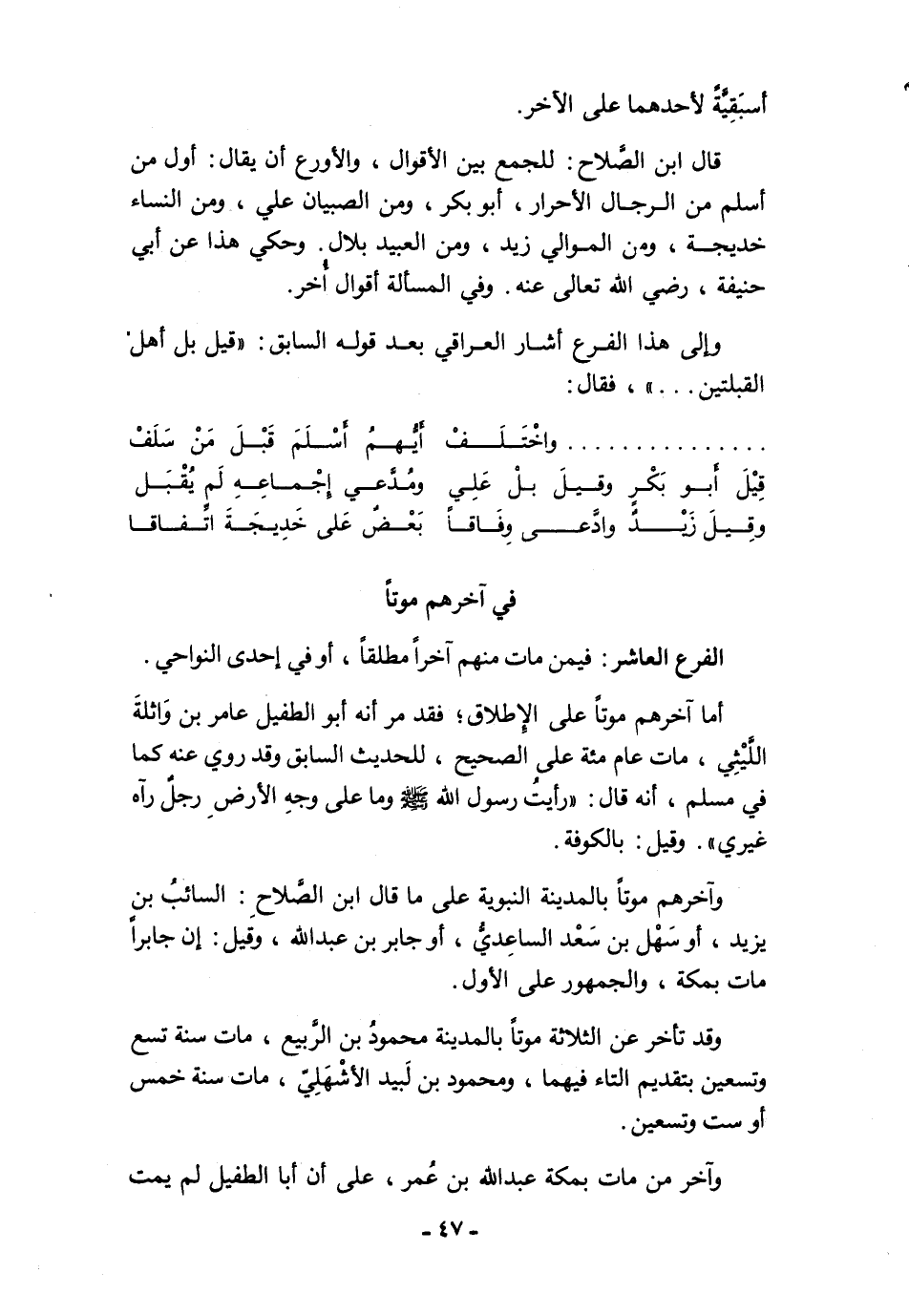 قال ابن الصَّلاح: للجمع بين الأقوال، والأورع أن يقال: أول من أسلم من الرجال الأحرار، أبو بكر، ومن الصبيان علي، ومن النساء خديجة، ومن الموالي زيد، ومن العبيد بلال. وحكي هذا عن أبي حنيفة، رضي الله تعالى عنه. وفي المسألة أقوال أُخر.