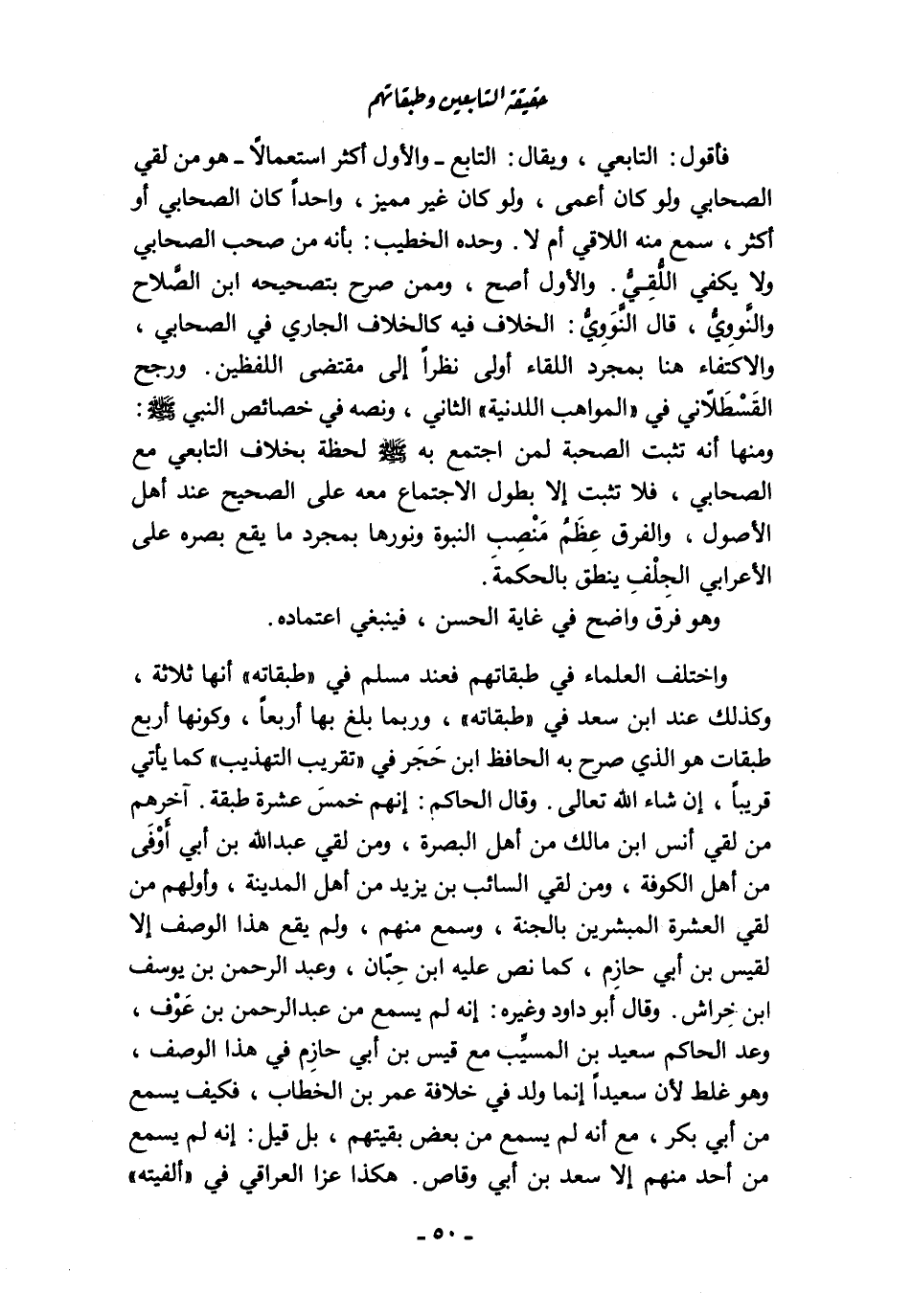 فأقول: التابعي، ويقال: التابع -والأول أكثر استعمالًا- هو من لقي الصحابي ولو كان أعمى، ولو كان غير مميز، واحدًا كان الصحابي أو أكثر، سمع منه اللاقي أم لا. وحده الخطيب: بأنه من صحب الصحابي ولا يكفي اللُّقِيُّ. والأول أصح، وممن صرح بتصحيحه ابن الصَّلاح والنَّوويُّ، قال النَّوَوِيُّ: الخلاف فيه كالخلاف الجاري في الصحابي، والاكتفاء هنا بمجرد اللقاء أولى نظرًا إلى مقتضى اللفظين. ورجح القَسْطَلاني في "المواهب اللدنية" الثاني، ونصه في خصائص النبي - صلى الله عليه وسلم -: ومنها أنه تثبت الصحبة لمن اجتمع به - صلى الله عليه وسلم - لحظة بخلاف التابعي مع الصحابي، فلا تثبت إلا بطول الاجتماع معه على الصحيح عند أهل الأصول، والفرق عِظَمُ مَنْصِب النبوة ونورها بمجرد ما يقع بصره على الأعرابي الجِلْفِ ينطق بالحكمةَ.