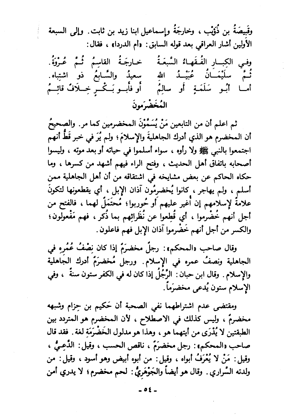 ثم اعلم أن من التابعين مَنْ يُسَمَّوْنَ المخضرمين كما مر. والصحيحُ أن المخضرم هو الذي أدرك الجاهليةَ والإِسلامَ؛ ولم يُرَ في خبر قَطُّ أنهم اجتمعوا بالنبي - صلى الله عليه وسلم - ولا رأوه، سواء أسلموا في حياته أو بعد موته، وليسوا أصحابه باتفاق أهل الحديث، وفتح الراء فيهم أشهد من كسرها، وما حكاه الحاكم عن بعض مشايخه في اشتقاقه من أن أهل الجاهلية ممن أسلم، ولم يهاجر، كانوا يُخضرمُون آذان الإبل، أي يقطعونها لتكونَ علامة لإسلامهم إن أُغير عليهم أو حُوربوا؛ مُحتَمَلٌ لهما، فالفتح من أجل أنهم خُضْرموا، أي قُطِعوا عن نُظَرائِهم بما ذُكر، فهم مَفْعولون؛ والكسر من أجل أنهم خَضْرموا آذان الإبل فهم فاعلون.
