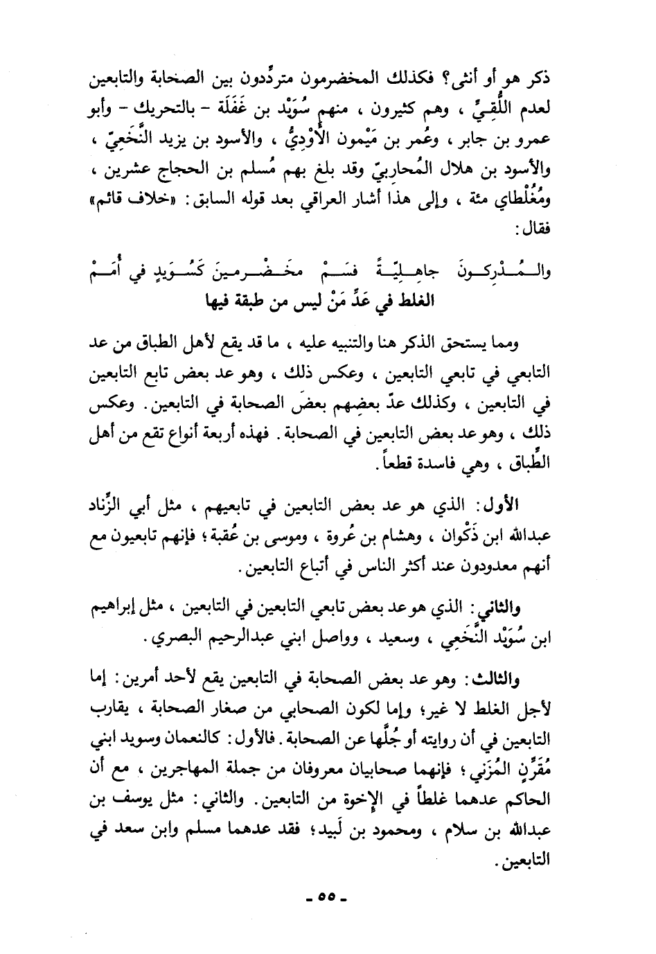 والثالث: وهو عد بعض الصحابة في التابعين يقع لأحد أمرين: إما لأجل الغلط لا غير؛ وإما لكون الصحابي من صغار الصحابة، يقارب التابعين في أن روايته أو جُلَّها عن الصحابة. فالأول: كالنعمان وسويد ابني مُقَرِّنٍ المُزَني؛ فإنهما صحابيان معروفان من جملة المهاجرين، مع أن الحاكم عدهما غلطًا في الإخوة من التابعين. والثاني: مثل يوسف بن عبد الله بن سلام، ومحمود بن لَبيد؛ فقد عدهما مسلم وابن سعد في التابعين.