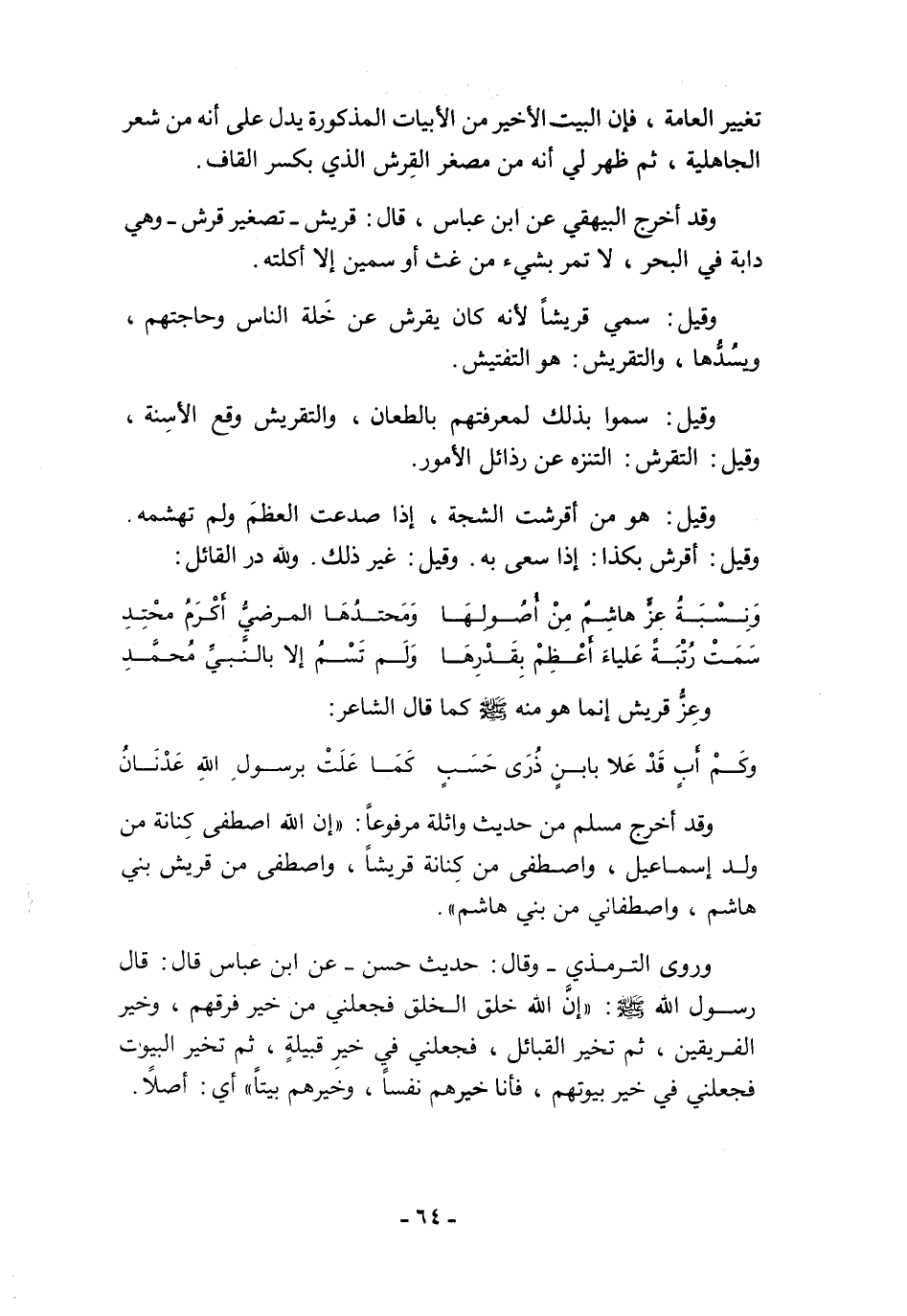 وقد أخرج البيهقي عن ابن عباس، قال: قريش -تصغير قرش- وهي دابة في البحر، لا تمر بشيء من غث أو سمين إلا أكلته.