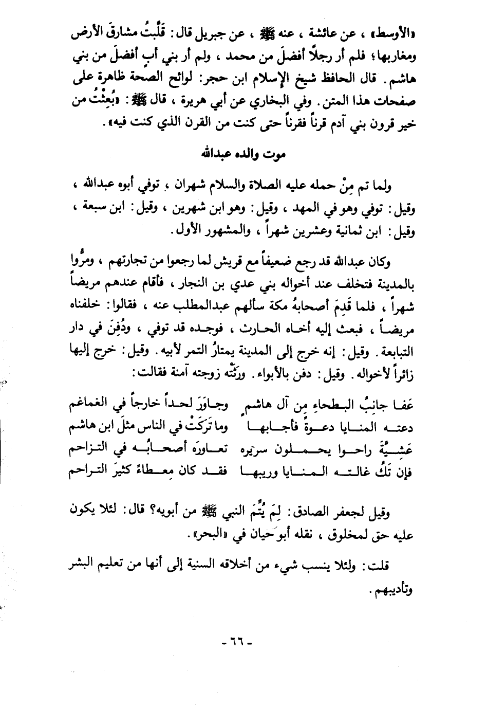 "الأوسط"، عن عائشة، عنه - صلى الله عليه وسلم - عن جبريل قال: قَلَّبتُ مشارقَ الأرض ومغاربها؛ فلم أر رجلًا أفضل من محمَّد، ولم أر بني أبٍ أفضلَ من بني هاشم. قال الحافظ شيخ الإِسلام ابن حجر: لوائح الصحة ظاهرة على صفحات هذا المتن. وفي البخاري عن أبي هريرة، قال - صلى الله عليه وسلم -: "بُعِثتُ من خير قرون بني آدم قرنًا فقرنًا حتى كنت من القرن الذي كنت فيه".