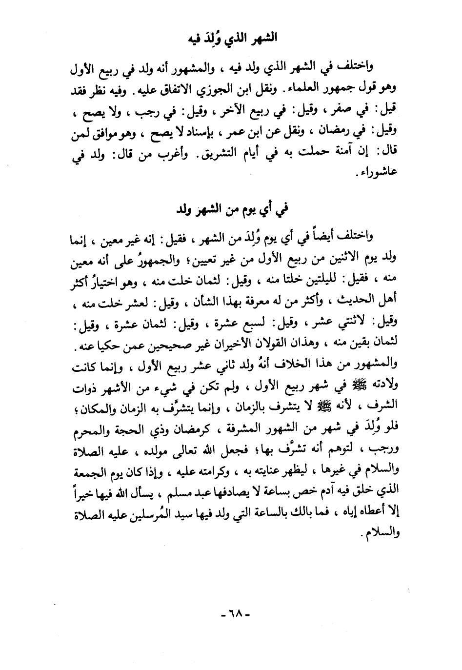 والمشهور من هذا الخلاف أنهُ ولد ثاني عشر ربيع الأول، وإنما كانت ولادته - صلى الله عليه وسلم - في شهر ربيع الأول، ولم تكن في شيء من الأشهر ذوات الشرف؛ لأنه - صلى الله عليه وسلم - لا يتشرف بالزمان، وإنما يتشرف به الزمان والمكان؛ فلو وُلِدَ في شهر من الشهور المشرفة، كرمضان وذي الحجة والمحرم ورجب، لتوهم أنه تشرَّف بها؛ فجعل الله تعالى مولده، عليه الصلاة والسلام في غيرها ليظهر عنايته به، وكرامته عليه، وإذا كان يوم الجمعة الذي خلق فيه آدم خص بساعة لا يصادفها عبد مسلم، يسأل الله فيها خيرًا إلا أعطاه إياه، فما بالك بالساعة التي ولد فيها سيد المُرسلين عليه الصلاة والسلام.