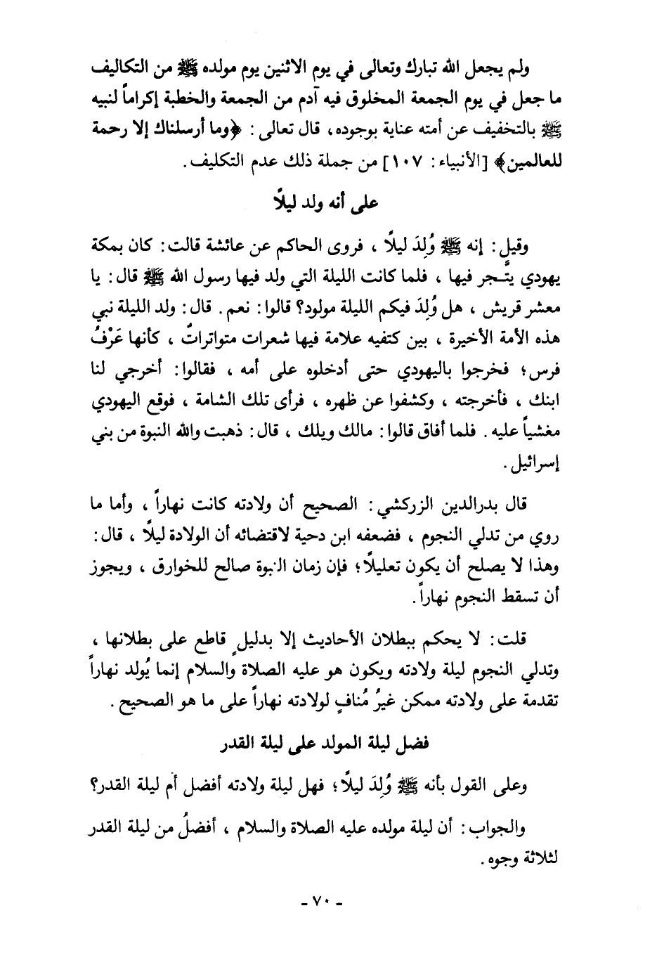 وقيل: إنه - صلى الله عليه وسلم - وُلِدَ ليلًا، فروى الحاكم عن عائشة قالت: كان بمكة يهودي يتجر فيها، فلما كانت الليلة التي ولد فيها رسول الله - صلى الله عليه وسلم - قال: يا معشر قريش، هل وُلِدَ فيكم الليلة مولود؟ قالوا: نعم. قال: ولد الليلة نبي هذه الأمة الأخيرة، بين كتفيه علامة فيها شعرات متواتراتٌ، كأنها عَرْفُ فرس؛ فخرجوا باليهودي حتى أدخلوه على أمه، فقالوا: أخرجي لنا ابنك، فأخرجته، وكشفوا عن ظهره، فرأى تلك الشامة، فوقع اليهودي مغشيًا عليه. فلما أفاق قالوا: مالك ويلك، قال: ذهبت والله النبوة من بني إسرائيل.