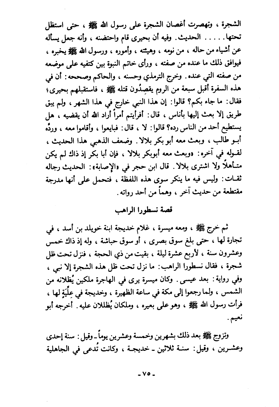 ثم خرج - صلى الله عليه وسلم -، ومعه ميسرة، غلام خديجة ابنة خويلد بن أسد، في تجارة لها، حتى بلغ سوق بصرى، أو سوق حباشة، وله إذ ذاك خمس وعشرون سنة، لأربع عشرة ليلة، بقيت من ذي الحجة، فنزل تحت ظل شجرة، فقال نسطورا الراهب: ما نزل تحت ظل هذه الشجرة إلا نبي، وفي رواية: بعد عيسى. وكان ميسرة يرى في الهاجرة ملكين يُظلانه من الشمس، ولما رجعوا إلى مكة في ساعة الظهيرة، وخديجة في عِلِّيَةٍ لها، فرأت رسول الله - صلى الله عليه وسلم - وهو على بعيره، وملكان يُظللان عليه. أخرجه أبو نعيم.