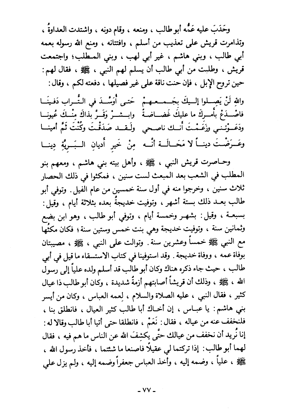 وحَدَبَ عليه عَمُّه أبو طالب، ومنعه، وقام دونه، واشتدت العداوةُ، وتذامرت قريش على تعذيب من أسلم، وافتتانه، ومنع الله رسوله بعمه أبي طالب، وبني هاشم، غير أبي لهب، وبني المطلب؛ واجتمعت قريش، وطلبت من أبي طالب أن يسلم لهم النبي - صلى الله عليه وسلم - فقال لهم: حين تروح الإِبل، فإن حنت ناقة على غير فصيلها، دفعته لكم، وقال:
