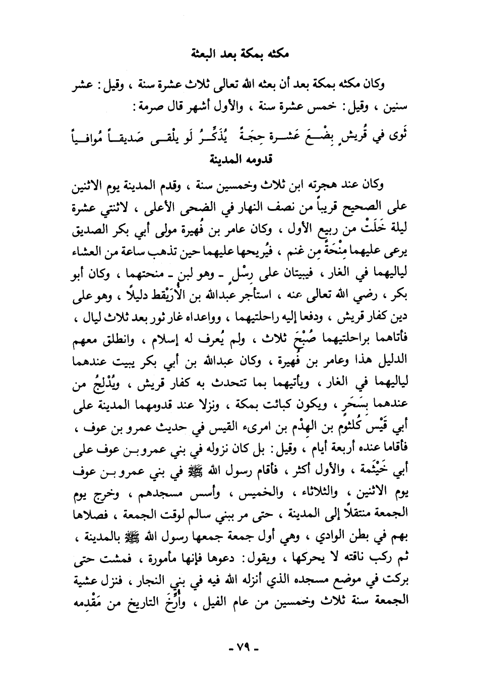 وكان عند هجرته ابن ثلاث وخمسين سنة، وقدم المدينة يوم الاثنين على الصحيح قريبًا من نصف النهار في الضحى الأعلى، لاثنتي عشرة ليلة خَلَتْ من ربيع الأول، وكان عامر بن فُهيرة مولى أبي بكر الصديق يرعى عليهما مِنْحَةً مِن غنم، فيُريحها عليهما حين تذهب ساعة من العشاء لياليهما في الغار، فيبيتان على رِسْلٍ -وهو لبنٍ- منحتهما، وكان أبو بكر، رضي الله تعالى عنه، استأجر عبد الله بن الأُرَيْقط دليلًا، وهو على دين كفار قريش، ودفعا إليه راحلتيهما، وواعداه غار ثور بعد ثلاث ليال، فأتاهما براحلتيهما صُبْحَ ثلاث، ولم يُعرف له إسلام، وانطلق معهم الدليل هذا وعامر بن فُهيرة، وكان عبد الله بن أبي بكر يبيت عندهما لياليهما في الغار، ويأتيهما بما تتحدث به كفار قريش، ويُدْلِجُ من عندهما بِسَحَرٍ، ويكون كبائت بمكة، ونزلا عند قدومهما المدينة على أبي قَيْس كُلثوم بن الهِدْم بن امرئ القيس في حديث عمرو بن عوف، فأقاما عنده أربعة أيام، وقيل: بل كان نزوله في بني عمرو بن عوف على أبي خَيْثَمة، والأول أكثر، فأقام رسول الله - صلى الله عليه وسلم - في بني عمرو بن عوف يوم الاثنين، والثلاثاء، والخميس، وأسس مسجدهم، وخرج يوم الجمعة منتقلًا إلى المدينة، حتى مر ببني سالم لوقت الجمعة، فصلاها بهم في بطن الوادي، وهي أول جمعة جمعها رسول الله - صلى الله عليه وسلم - بالمدينة، ثم ركب ناقته لا يحركها، ويقول: دعوها فإنها مأمورة، فمشت حتى بركت في موضع مسجده الذي أنزله الله فيه في بني النجار، فنزل عشية الجمعة سنة ثلاث وخمسين من عام الفيل، وأُرِّخَ التاريخ من مَقْدِمه