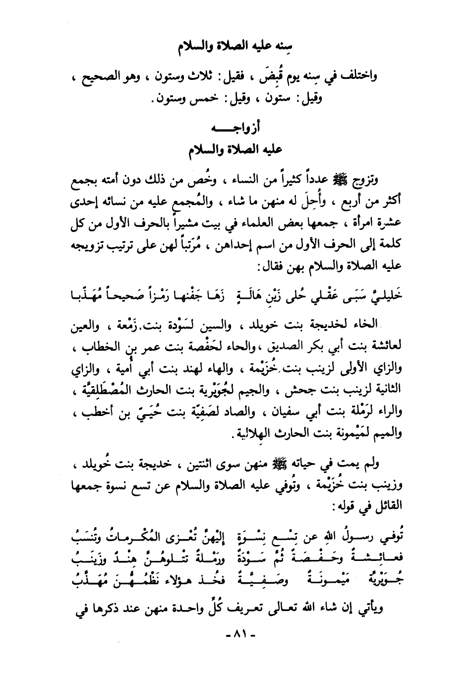 وتزوج - صلى الله عليه وسلم - عددًا كثيرًا من النساء، وخُص من ذلك دون أمته بجمع أكثر من أربع، وأُحِلَ له منهن ما شاء، والمُجمع عليه من نسائه إحدى عشرة امرأة، جمعها بعض العلماء في بيت مشيرًا بالحرف الأول من كل كلمة إلى الحرف الأول من اسم إحداهن، مُرَتبًا لهن على ترتيب تزويجه عليه الصلاة والسلام بهن فقال: