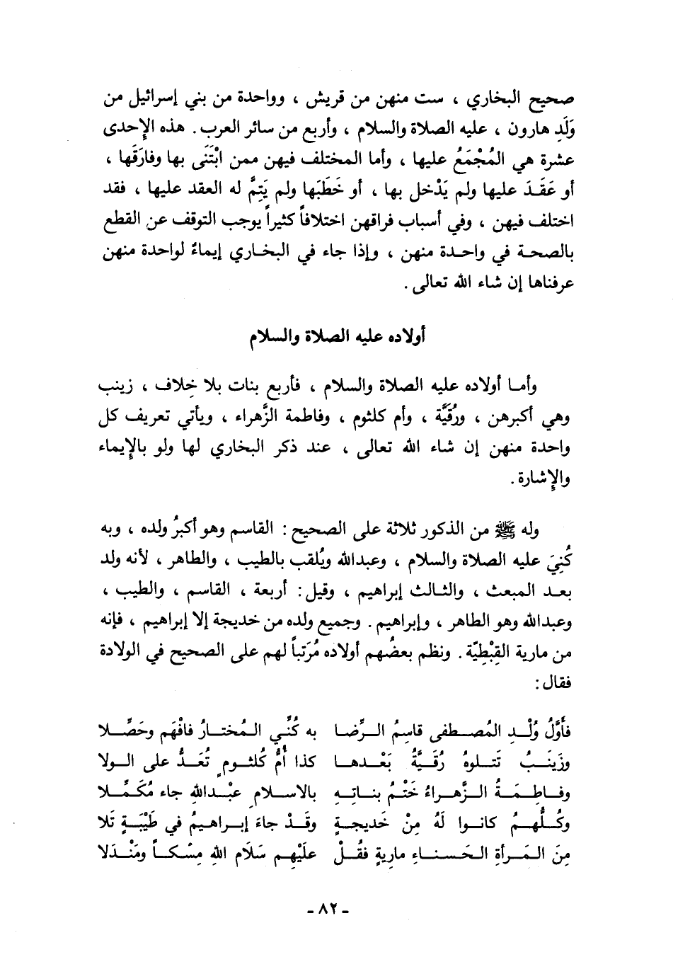 وله - صلى الله عليه وسلم - من الذكور ثلاثة على الصحيح: القاسم وهو أكبرُ ولده، وبه كُنِيَ عليه الصلاة والسلام، وعبد الله ويُلقب بالطيب، والطاهر، لأنه ولد بعد المبعث، والثالث إبراهيم، وقيل: أربعة، القاسم، والطيب، وعبد الله وهو الطاهر، وإبراهيم. وجميع ولده من خديجة إلا إبراهيم، فإنه من مارية القِبْطِيَّة. ونظم بعضُهم أولاده مُرَتبًا لهم على الصحيح في الولادة فقال: