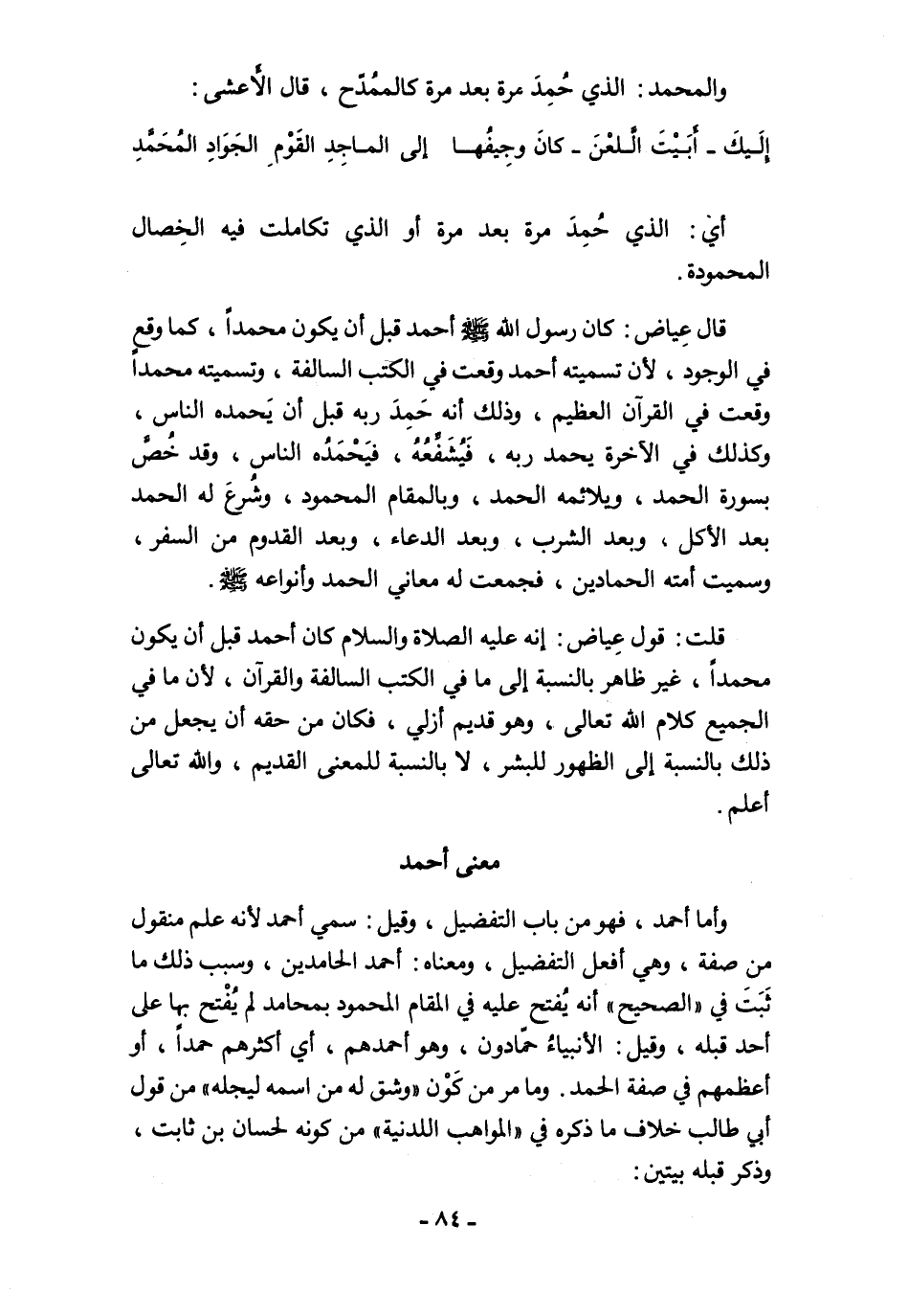 قال عِياض: كان رسول الله - صلى الله عليه وسلم - أحمد قبل أن يكون محمدًا، كما وقع في الوجود، لأنّ تسميته أحمد وقعت في الكتب السالفة، وتسميته محمدًا وقعت في القرآن العظيم، وذلك أنه حَمِدَ ربه قبل أن يَحمده الناس، وكذلك في الآخرة يحمد ربه، فَيُشَفِّعُهُ، فيَحْمَدُه الناس، وقد خُصَّ بسورة الحمد، ويلائمه الحمد، وبالمقام المحمود، وشُرعَ له الحمد بعد الأكل، وبعد الشرب، وبعد الدعاء، وبعد القدوم من السفر، وسميت أمته الحمادين، فجمعت له معاني الحمد وأنواعه - صلى الله عليه وسلم -.