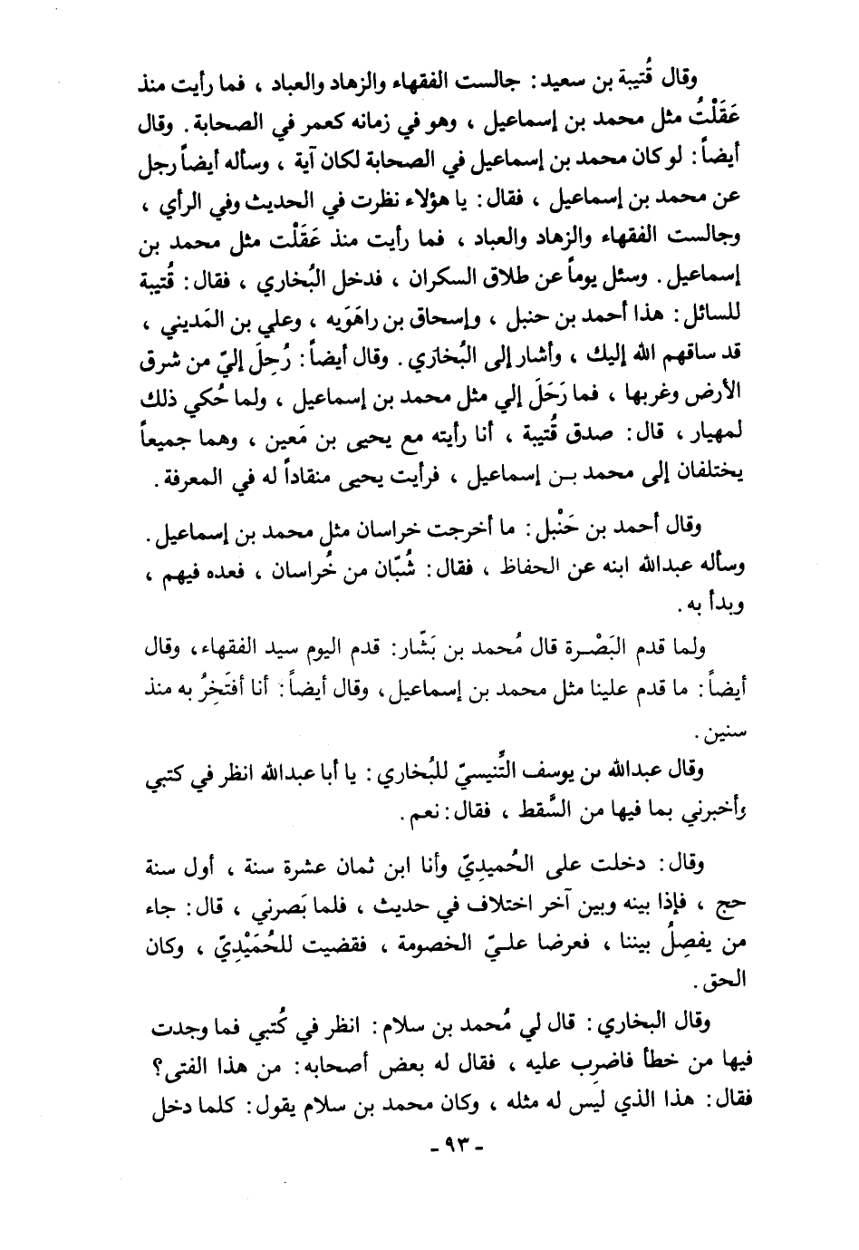 وقال البخاري: قال لي مُحمد بن سلام: انظر في كُتبي فما وجدت فيها من خطأ فاضرب عليه، فقال له بعض أصحابه: من هذا الفتى؟ فقال: هذا الذي ليَس له مثله، وكان محمَّد بن سلام يقول: كلما دخل