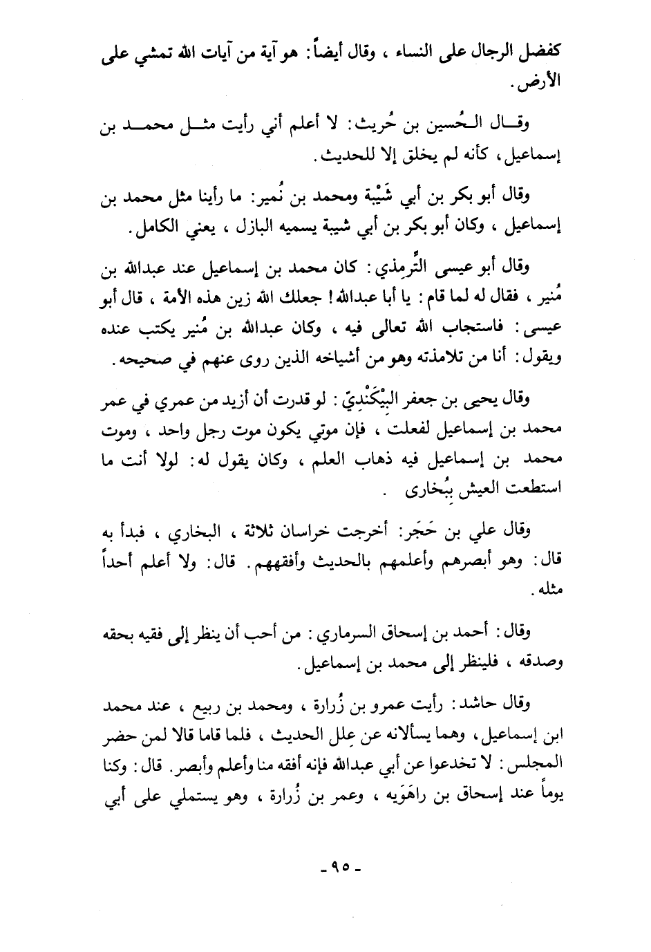 وقال أبو بكر بن أبي شَيْبة ومحمد بن نُمير: ما رأينا مثل محمَّد بن إسماعيل، وكان أبو بكر بن أبي شيبة يسميه البازل، يعني الكامل.