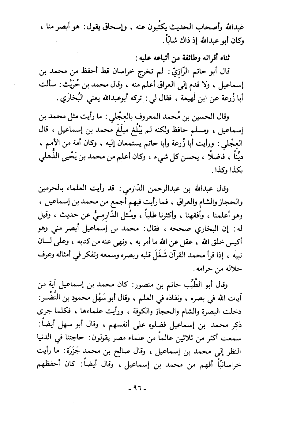 وقال الحسين بن مُحمد المعروف بالعِجْلي: ما رأيت مثل محمَّد بن إسماعيل، ومسلم حافظ ولكنه لم يَبْلُغ مبلَغَ محمَّد بن إسماعيل، قال العِجْلي: ورأيت أبا زُرعة وأبا حاتم يستمعان إليه، وكان أمة من الأمم، ديِّنًا، فاضلًا، يحسن كل شيء، وكان أعلم من محمَّد بن يَحْيى الذهلي بكذا وكذا.