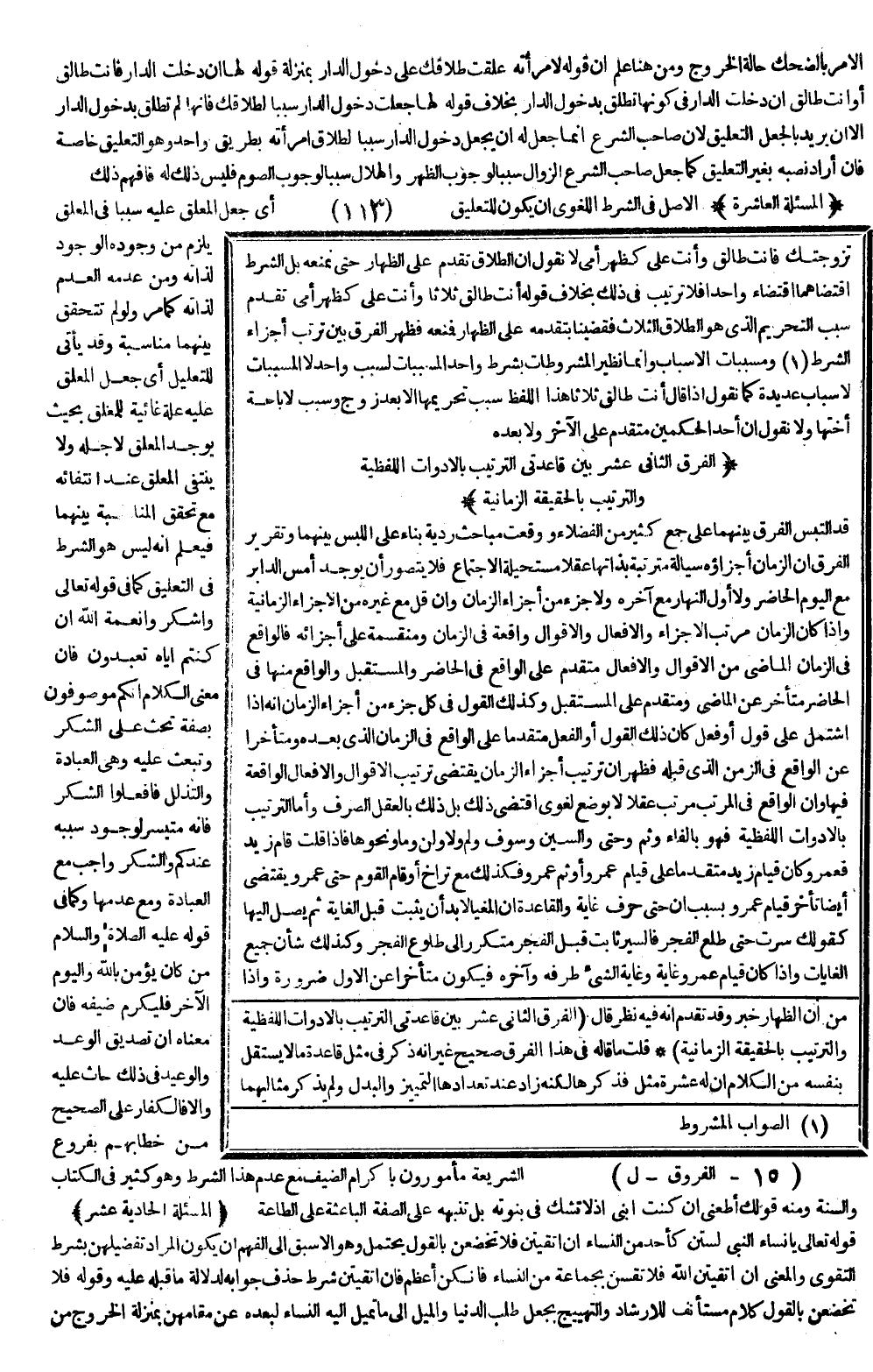 (الْفَرْقُ الثَّانِيَ عَشَرَ بَيْنَ قَاعِدَتَيْ التَّرْتِيبِ بِالْأَدَوَاتِ اللَّفْظِيَّةِ وَالتَّرْتِيبِ بِالْحَقِيقَةِ الزَّمَانِيَّةِ) قَدْ الْتَبَسَ الْفَرْقُ بَيْنَهُمَا عَلَى جَمْعٍ كَثِيرٍ مِنْ الْفُضَلَاءِ وَوَقَعَتْ مَبَاحِثُ رَدِيَّةٌ بِنَاءً عَلَى اللَّبْسِ بَيْنَهُمَا وَتَقْرِيرُ الْفَرْقِ أَنَّ الزَّمَانَ أَجْزَاؤُهُ سَيَّالَةٌ مُتَرَتِّبَةٌ بِذَاتِهَا عَقْلًا مُسْتَحِيلَةُ الِاجْتِمَاعِ فَلَا يُتَصَوَّرُ أَنْ يُوجَدَ أَمْسُ الدَّابِرُ مَعَ الْيَوْمِ الْحَاضِرِ وَلَا أَوَّلُ النَّهَارِ مَعَ آخِرِهِ وَلَا جُزْءٌ مِنْ أَجْزَاءِ الزَّمَانِ وَإِنْ قَلَّ مَعَ غَيْرِهِ مِنْ الْأَجْزَاءِ الزَّمَانِيَّةِ وَإِذَا كَانَ الزَّمَانُ مُرَتَّبُ الْأَجْزَاءِ وَالْأَفْعَالُ وَالْأَقْوَالُ وَاقِعَةٌ فِي الزَّمَانِ وَمُنْقَسِمَةٌ عَلَى أَجْزَائِهِ فَالْوَاقِعُ فِي الزَّمَانِ الْمَاضِي مِنْ الْأَقْوَالِ وَالْأَفْعَالِ مُتَقَدِّمٌ عَلَى الْوَاقِعِ فِي الْحَاضِرِ وَالْمُسْتَقْبَلِ وَالْوَاقِعُ مِنْهَا فِي الْحَاضِرِ مُتَأَخِّرٌ عَنْ الْمَاضِي وَمُتَقَدِّمٌ عَلَى الْمُسْتَقْبَلِ وَكَذَلِكَ الْقَوْلُ فِي كُلِّ جُزْءٍ مِنْ أَجْزَاءِ الزَّمَانِ أَنَّهُ إذَا اشْتَمَلَ عَلَى قَوْلٍ أَوْ فِعْلٍ كَانَ ذَلِكَ الْقَوْلُ أَوْ الْفِعْلُ مُتَقَدِّمًا عَلَى الْوَاقِعِ فِي الزَّمَانِ الَّذِي بَعْدَهُ وَمُتَأَخِّرًا عَنْ الْوَاقِعِ فِي الزَّمَنِ الَّذِي قَبْلَهُ فَظَهَرَ أَنَّ تَرْتِيبَ أَجْزَاءِ الزَّمَانِ يَقْتَضِي تَرْتِيبَ الْأَقْوَالِ وَالْأَفْعَالِ الْوَاقِعَةِ فِيهَا وَأَنَّ الْوَاقِعَ فِي الْمُرَتَّبِ مُرَتَّبٌ عَقْلًا لَا بِوَضْعٍ لُغَوِيٍّ اقْتَضَى ذَلِكَ بَلْ ذَلِكَ بِالْعَقْلِ الصِّرْفِ وَأَمَّا التَّرْتِيبُ بِالْأَدَوَاتِ اللَّفْظِيَّةِ فَهُوَ بِالْفَاءِ وَثُمَّ وَحَتَّى وَالسِّينِ وَسَوْفَ وَلَمْ وَلَا وَلَنْ وَمَا وَنَحْوِهَا.