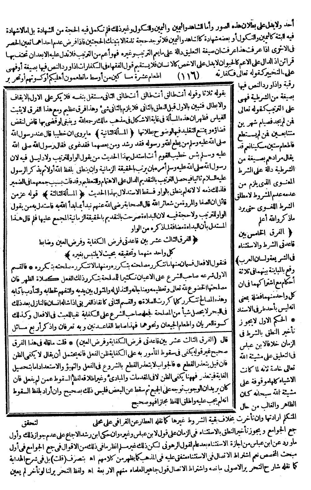 (الْفَرْقُ الْخَامِسُ بَيْنَ قَاعِدَتَيْ الشَّرْطِ وَالِاسْتِثْنَاءِ فِي الشَّرِيعَةِ وَلِسَانِ الْعَرَبِ) وَقَعَ بِالْمُبَايَنَةِ بَيْنَهُمَا فِي ثَلَاثَةِ أَحْكَامٍ مَعَ اشْتِرَاكِهِمَا فِي أَنَّ كُلَّ وَاحِدٍ مِنْهُمَا فَضْلَةٌ بِمَعْنَى أَنَّهُ لَيْسَ بِأَحَدِ طَرَفَيْ فِي الْإِسْنَادِ الْحُكْمُ الْأَوَّلُ لَا يَجُوزُ تَأْخِيرُ النُّطْقِ بِالشَّرْطِ فِي الزَّمَانِ خِلَافًا لِابْنِ عَبَّاسٍ فِي التَّعْلِيقِ عَلَى مَشِيئَةِ اللَّهِ تَعَالَى خَاصَّةً لِأَنَّهُ لَمَّا كَانَتْ الْأَشْيَاءُ كُلُّهَا مَوْقُوفَةً عَلَى مَشِيئَةِ اللَّهِ سُبْحَانَهُ كَانَ الظَّاهِرُ وَالْغَالِبُ مِنْ حَالِ الْمُتَكَلِّمِ إرَادَتَهَا وَإِنْ تَأَخَّرَتْ بِخِلَافِ بَقِيَّةِ الشُّرُوطِ وَغَيْرِهَا كَمَا نَقَلَهُ الْعَطَّارُ عَنْ الْقَرَافِيِّ عَلَى مُحَلَّى جَمْعِ الْجَوَامِعِ وَيَجُوزُ تَأْخِيرُ النُّطْقِ بِالِاسْتِثْنَاءِ فِي الزَّمَانِ عَلَى قَوْلٍ لِابْنِ عَبَّاسٍ وَغَيْرِهِ وَإِنْ حَكَى ابْنُ رُشْدٍ الْإِجْمَاعَ عَلَى عَدَمِ جَوَازِ ذَلِكَ وَأَوَّلُ مَا وَرَدَ عَنْ ابْنِ عَبَّاسٍ مِنْ إجَازَةِ الِاسْتِثْنَاءِ بَعْدَ عَامٍّ لِقَوْلِ الرَّهُونِيِّ لَكِنَّ ذَلِكَ غَيْرُ مُسَلَّمٍ اُنْظُرْ مَا فِي ذَلِكَ مِنْ الْأَقْوَالِ فِي جَمْعِ الْجَوَامِعِ فِي أَوَّلِ مَبْحَثِ الْمُخَصِّصِ نَعَمْ اشْتِرَاطُ الِاتِّصَالِ فِي الِاسْتِثْنَاءِ مُتَّفَقٌ عَلَيْهِ فِي الْمَذْهَبِ كَمَا يَظْهَرُ مِنْ كَلَامِهِمْ اهـ بِتَصَرُّفٍ.