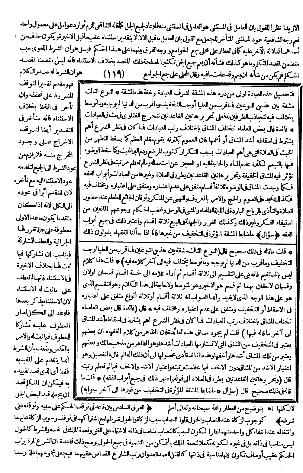 فَتَحْصِيلُ هَذِهِ الْعِبَادَةِ أَوْلَى مِنْ دَرْءِ هَذِهِ الْمَشَقَّةِ لِشَرَفِ الْعِبَادَةِ وَخِفَّةِ هَذِهِ الْمَشَقَّةِ النَّوْعُ الثَّالِثُ مَشَقَّةٌ بَيْنَ هَذَيْنِ النَّوْعَيْنِ فَمَا قَرُبَ مِنْ الْعُلْيَا أَوْجَبَ التَّخْفِيفَ وَمَا قَرُبَ مِنْ الدُّنْيَا لَمْ يُوجِبْهُ وَمَا تَوَسَّطَ يُخْتَلَفُ فِيهِ لِتَجَاذُبِ الطَّرَفَيْنِ لَهُ فَعَلَى تَحْرِيرِ هَاتَيْنِ الْقَاعِدَتَيْنِ تَتَخَرَّجُ الْفَتَاوَى فِي مَشَاقِّ الْعِبَادَاتِ.