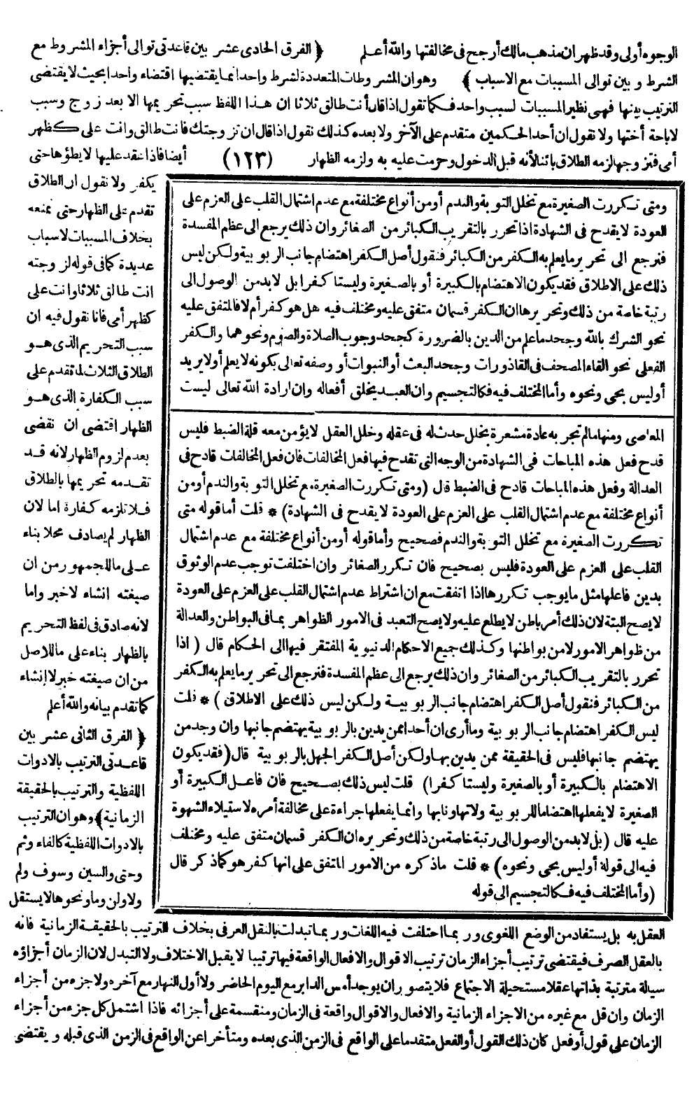 (الْفَرْقُ الثَّانِي عَشَرَ بَيْنَ قَاعِدَتَيْ التَّرْتِيبِ بِالْأَدَوَاتِ اللَّفْظِيَّةِ وَالتَّرْتِيبِ بِالْحَقِيقَةِ الزَّمَانِيَّةِ) وَهُوَ أَنَّ التَّرْتِيبَ بِالْأَدَوَاتِ اللَّفْظِيَّةِ كَالْفَاءِ وَثُمَّ وَحَتَّى وَالسِّينِ وَسَوْفَ وَلَمْ وَلَا وَلَنْ وَمَا وَنَحْوِهَا لَا يَسْتَقِلُّ الْعَقْلُ بِهِ بَلْ يُسْتَفَادُ مِنْ الْوَضْعِ اللُّغَوِيِّ وَرُبَّمَا اخْتَلَفَ فِيهِ اللُّغَاتُ وَرُبَّمَا تَبَدَّلَتْ بِالنَّقْلِ الْعُرْفِيِّ بِخِلَافِ التَّرْتِيبِ بِالْحَقِيقَةِ الزَّمَانِيَّةِ فَإِنَّهُ بِالْعَقْلِ الصِّرْفِ فَيَقْتَضِي تَرْتِيبُ أَجْزَاءِ الزَّمَانِ تَرْتِيبَ الْأَقْوَالِ وَالْأَفْعَالِ الْوَاقِعَةِ فِيهَا تَرْتِيبًا لَا يَقْبَلُ الِاخْتِلَافَ وَلَا التَّبَدُّلَ لِأَنَّ الزَّمَانَ أَجْزَاؤُهُ سَيَّالَةٌ مُتَرَتِّبَةٌ بِذَاتِهَا عَقْلًا مُسْتَحِيلَةُ الِاجْتِمَاعِ فَلَا يُتَصَوَّرُ أَنْ يُوجَدَ أَمْسُ الدَّابِرُ مَعَ الْيَوْمِ الْحَاضِرِ وَلَا أَوَّلُ النَّهَارِ مَعَ آخِرِهِ وَلَا جُزْءٌ مِنْ أَجْزَاءِ الزَّمَانِ وَإِنْ قَلَّ مَعَ غَيْرِهِ مِنْ الْأَجْزَاءِ الزَّمَانِيَّةِ وَالْأَفْعَالُ وَالْأَقْوَالُ وَاقِعَةٌ فِي الزَّمَانِ وَمُنْقَسِمَةٌ عَلَى أَجْزَائِهِ.