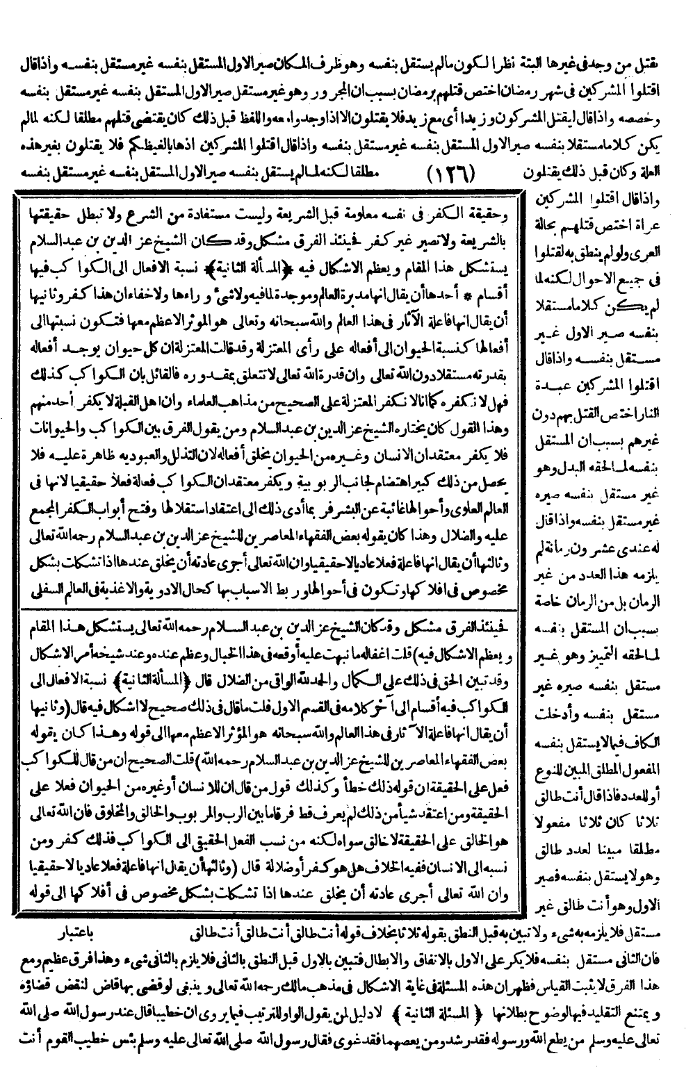 قَالَ: (وَثَانِيهَا أَنْ يُقَالَ: إنَّهُ فَاعِلَةُ الْآثَارِ فِي هَذَا الْعَالَمِ وَاَللَّهُ سُبْحَانَهُ هُوَ الْمُؤَثِّرُ الْأَعْظَمُ مَعَهَا إلَى قَوْلِهِ وَهَذَا كَانَ يَقُولُهُ بَعْضُ الْفُقَهَاءِ الْمُعَاصِرِينَ لِلشَّيْخِ عِزِّ الدِّينِ بْنِ عَبْدِ السَّلَامِ - رَحِمَهُ اللَّهُ -) قُلْتُ الصَّحِيحُ أَنَّ مَنْ قَالَ لِلْكَوَاكِبِ فِعْلٌ عَلَى الْحَقِيقَةِ أَنَّ قَوْلَهُ ذَلِكَ خَطَأٌ وَكَذَلِكَ قَوْلُ مَنْ قَالَ: إنَّ لِلْإِنْسَانِ أَوْ غَيْرِهِ مِنْ الْحَيَوَانِ فِعْلًا عَلَى الْحَقِيقَةِ وَمَنْ اعْتَقَدَ شَيْئًا مِنْ ذَلِكَ لَمْ يَعْرِفْ قَطُّ فَرْقًا مَا بَيْنَ الرَّبِّ وَالْمَرْبُوبِ وَالْخَالِقِ وَالْمَخْلُوقِ فَإِنَّ اللَّهَ تَعَالَى هُوَ الْخَالِقُ عَلَى الْحَقِيقَةِ لَا خَالِقَ سِوَاهُ لَكِنَّهُ مَنْ نَسَبَ الْفِعْلَ الْحَقِيقِيَّ إلَى الْكَوَاكِبِ فَذَلِكَ كُفْرٌ وَمَنْ نَسَبَهُ إلَى الْإِنْسَانِ فَفِيهِ الْخِلَافُ هَلْ هُوَ كُفْرٌ أَوْ ضَلَالَةٌ.