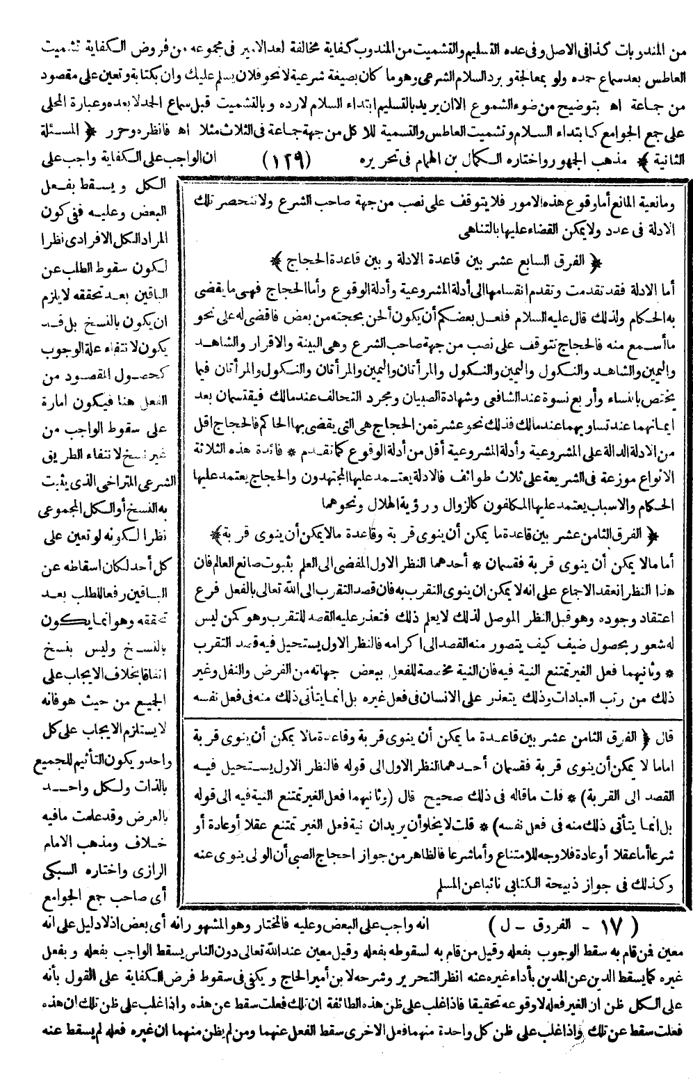 (الْفَرْقُ السَّابِعَ عَشَرَ بَيْنَ قَاعِدَةِ الْأَدِلَّةِ وَبَيْنَ قَاعِدَةِ الْحِجَاجِ) أَمَّا الْأَدِلَّةُ فَقَدْ تَقَدَّمَتْ وَتَقَدَّمَ انْقِسَامُهَا إلَى أَدِلَّةِ الْمَشْرُوعِيَّةِ وَأَدِلَّةِ الْوُقُوعِ وَأَمَّا الْحِجَاجُ فَهِيَ مَا يَقْضِي بِهِ الْحُكَّامُ وَلِذَلِكَ قَالَ: - عَلَيْهِ السَّلَامُ - «فَلَعَلَّ بَعْضَكُمْ أَنْ يَكُونَ أَلْحَنُ بِحُجَّتِهِ مِنْ بَعْضٍ فَأَقْضِي لَهُ عَلَى نَحْوِ مَا أَسْمَعُ مِنْهُ» فَالْحِجَاجُ تَتَوَقَّفُ عَلَى نَصْبٍ مِنْ جِهَةِ صَاحِبِ الشَّرْعِ وَهِيَ الْبَيِّنَةُ وَالْإِقْرَارُ وَالشَّاهِدُ وَالْيَمِينُ وَالشَّاهِدُ وَالنُّكُولُ وَالْيَمِينُ وَالنُّكُولُ وَالْمَرْأَتَانِ وَالْيَمِينُ وَالْمَرْأَتَانِ وَالنُّكُولُ وَالْمَرْأَتَانِ فِيمَا يَخْتَصُّ بِالنِّسَاءِ وَأَرْبَعُ نِسْوَةٍ عِنْدَ الشَّافِعِيِّ وَشَهَادَةُ الصِّبْيَانِ وَمُجَرَّدُ التَّحَالُفِ عِنْدَ مَالِكٍ فَيَقْتَسِمَانِ بَعْدَ أَيْمَانِهِمَا عِنْدَ تَسَاوِيهِمَا عِنْدَ مَالِكٍ فَذَلِكَ نَحْوُ عَشَرَةٍ مِنْ الْحِجَاجِ هِيَ الَّتِي يَقْضِي بِهَا الْحَاكِمُ فَالْحِجَاجُ أَقَلُّ مِنْ الْأَدِلَّةِ الدَّالَّةِ عَلَى الْمَشْرُوعِيَّةِ وَأَدِلَّةُ الْمَشْرُوعِيَّةِ أَقَلُّ مِنْ أَدِلَّةِ الْوُقُوعِ كَمَا تَقَدَّمَ فَائِدَةٌ هَذِهِ الثَّلَاثَةُ الْأَنْوَاعُ مُوَزَّعَةٌ فِي الشَّرِيعَةِ عَلَى ثَلَاثِ طَوَائِفَ فَالْأَدِلَّةُ يَعْتَمِدُ عَلَيْهَا الْمُجْتَهِدُونَ وَالْحِجَاجُ يَعْتَمِدُ عَلَيْهَا الْحُكَّامُ وَالْأَسْبَابُ يَعْتَمِدُ عَلَيْهَا الْمُكَلَّفُونَ كَالزَّوَالِ وَرُؤْيَةِ الْهِلَالِ وَنَحْوِهِمَا.