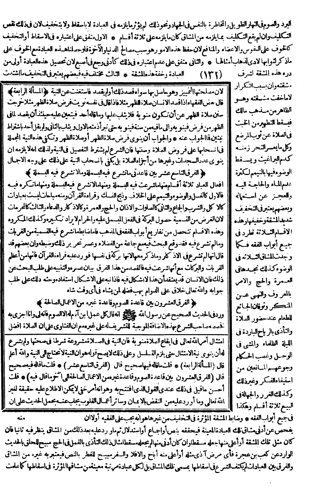 وَإِنْ بِسَبَبِ التَّكْرَارِ لَا مَا خَفَّتْ مَشَقَّتُهُ وَهُوَ الظَّاهِرُ مِنْ مَذْهَبِ مَالِكٍ فَيَسْقُطُ التَّطْهِيرُ مِنْ الْخُبْثِ فِي الصَّلَاةِ عَنْ ثَوْبِ الْمُرْضَعِ وَكُلُّ مَا يَعْسُرُ التَّحَرُّزُ مِنْهُ كَدَمِ الْبَرَاغِيثِ وَيَسْقُطُ الْوُضُوءُ فِيهَا بِالتَّيَمُّمِ لِكَثْرَةِ عَدَمِ الْمَاءِ وَالْحَاجَةِ إلَيْهِ وَالْعَجْزِ عَنْ اسْتِعْمَالِهِ وَبَعْضُهُمْ يَعْتَبِرُ فِي التَّخْفِيفِ شَدِيدَ الْمَشَقَّةِ وَخَفِيفَهَا وَهَذِهِ الْأَقْسَامُ الثَّلَاثَةُ تَطَّرِدُ فِي جَمِيعِ أَبْوَابِ الْفِقْهِ فَكَمَا وَجَدْت الْمَشَاقَّ الثَّلَاثَةَ فِي الْوُضُوءِ كَذَلِكَ تَجِدُهَا فِي الْعُمْرَةِ وَالْحَجِّ وَالْأَمْرِ بِالْمَعْرُوفِ وَالنَّهْيِ عَنْ الْمُنْكَرِ وَتَوَقَانِ الْجَائِعِ لِلطَّعَامِ عِنْدَ حُضُورِ الصَّلَاةِ وَالتَّأَذِّي بِالرِّيَاحِ الْبَارِدَةِ فِي اللَّيْلَةِ الظَّلْمَاءِ وَالْمَشْيِ فِي الْوَحْلِ وَغَصْبِ الْحُكَّامِ وَجُوعِهِمْ الْمَانِعَيْنِ مِنْ اسْتِيفَاءِ الْفِكْرِ وَغَيْرِ ذَلِكَ وَكَذَلِكَ الْغَرَرُ وَالْجَهَالَةُ فِي الْبَيْعِ ثَلَاثَةُ أَقْسَامٍ وَهَكَذَا فِي جَمِيعِ أَبْوَابِ الْفِقْهِ.