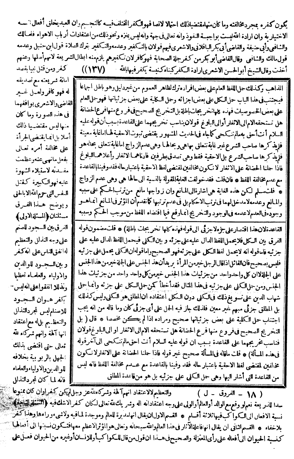 ـــــــــــــــــــــــــــــQيَكُونَ كُفْرُهُ بِمُجَرَّدِ مُخَالَفَتِهِ وَمَا كَانَ مِنْهَا مُقْتَضِيًا ذَلِكَ احْتِمَالًا لَا نَصًّا فَهُوَ الْكُفْرُ الْمُخْتَلَفُ فِيهِ كَالتَّجْسِيمِ وَأَنَّ الْعَبْدَ يَخْلُقُ أَفْعَالَ نَفْسِهِ الِاخْتِيَارِيَّةَ وَأَنَّ إرَادَةَ اللَّهِ لَيْسَتْ بِوَاجِبَةِ النُّفُوذِ وَأَنَّهُ تَعَالَى فِي جِهَةٍ وَأَنَّهُ لَيْسَ بِمُنَزِّهٍ وَنَحْوِ ذَلِكَ مِنْ اعْتِقَادَاتِ أَرْبَابِ الْأَهْوَاءِ فَلِمَالِكٍ وَالشَّافِعِيِّ وَأَبِي حَنِيفَةَ وَالْقَاضِي أَبِي بَكْرٍ الْبَاقِلَّانِيِّ وَالْأَشْعَرِيِّ فِيهِمْ قَوْلَانِ بِالتَّكْفِيرِ وَعَدَمِهِ وَالتَّكْفِيرُ بِتَرْكِ الصَّلَاةِ قَوْلُ ابْنِ حَنْبَلٍ وَعَدَمُهُ قَوْلُ مَالِكٍ وَالشَّافِعِيِّ وَقَالَ الْقَاضِي أَبُو بَكْرٍ: مَنْ كَفَّرَ جُمْلَةَ الصَّحَابَةِ فَهُوَ كَافِرٌ لِأَنَّ تَكْفِيرَهُمْ يُلْزِمُ إبْطَالَ الشَّرِيعَةِ لِأَنَّهُمْ أَصْلُهَا وَعَنْهُمْ أُخِذَتْ وَقَالَ الشَّيْخُ أَبُو الْحَسَنِ الْأَشْعَرِيُّ إرَادَةُ الْكُفْرِ كَبِنَاءِ كَنِيسَةٍ يُكْفَرُ فِيهَا بِاَللَّهِ كُفْرٌ وَمَنْ قَتَلَ نَبِيًّا بِقَصْدِ إمَاتَةِ شَرِيعَتِهِ مَعَ تَصْدِيقِهِ لَهُ فَهُوَ كَافِرٌ وَلَعَلَّ غَيْرَ الْقَاضِي وَالْأَشْعَرِيِّ يُوَافِقُهُمَا فِي هَذِهِ الصُّورَةِ.