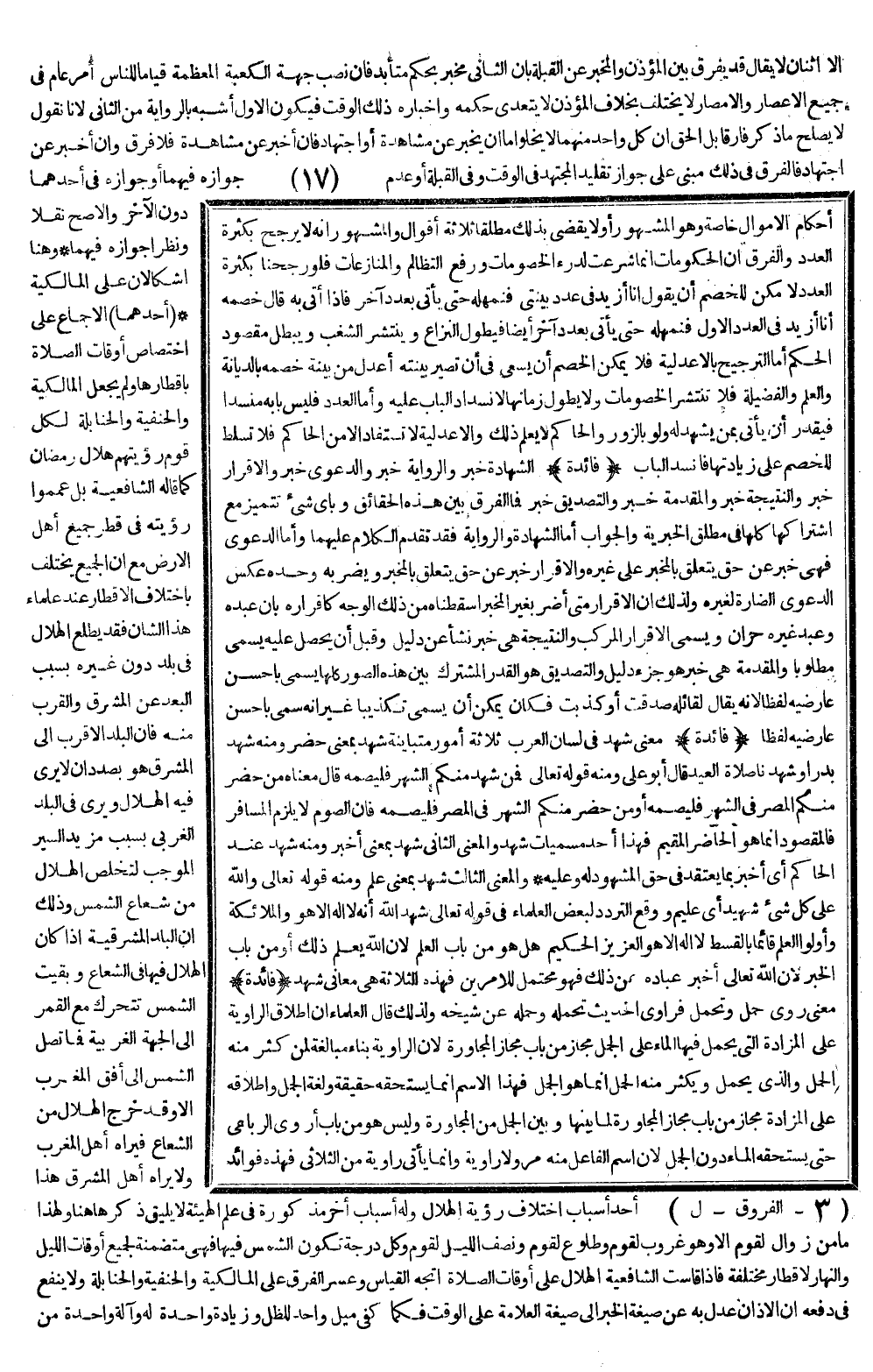 (أَحَدُهُمَا) الْإِجْمَاعُ عَلَى اخْتِصَاصِ أَوْقَاتِ الصَّلَاةِ بِأَقْطَارِهَا، وَلَمْ يَجْعَلْ الْمَالِكِيَّةُ وَالْحَنَفِيَّةُ وَالْحَنَابِلَةُ لِكُلِّ قَوْمٍ رُؤْيَتَهُمْ هِلَالَ رَمَضَانَ كَمَا قَالَهُ الشَّافِعِيَّةُ بَلْ عَمَّمُوا رُؤْيَتَهُ فِي قُطْرِ جَمِيعِ أَهْلِ الْأَرْضِ مَعَ أَنَّ الْجَمِيعَ يَخْتَلِفُ بِاخْتِلَافِ الْأَقْطَارِ عِنْدَ عُلَمَاءِ هَذَا الشَّأْنِ، فَقَدْ يَطْلُعُ الْهِلَالُ فِي بَلَدٍ دُونَ غَيْرِهِ بِسَبَبِ الْبُعْدِ عَنْ الْمَشْرِقِ وَالْقُرْبِ مِنْهُ فَإِنَّ الْبَلَدَ الْأَقْرَبَ إلَى الْمَشْرِقِ هُوَ بِصَدَدِ أَنْ لَا يُرَى فِيهِ الْهِلَالُ، وَيُرَى فِي الْبَلَدِ الْغَرْبِيِّ بِسَبَبِ مَزِيدِ السَّيْرِ الْمُوجِبِ لِتَخَلُّصِ الْهِلَالِ مِنْ شُعَاعِ الشَّمْسِ، وَذَلِكَ أَنَّ الْبَلَدَ الْمَشْرِقِيَّةَ إذَا كَانَ الْهِلَالُ فِيهَا فِي الشُّعَاعِ وَبَقِيَتْ الشَّمْسُ تَتَحَرَّكُ مَعَ الْقَمَرِ إلَى الْجِهَةِ الْغَرْبِيَّةِ فَمَا تَصِلُ الشَّمْسُ إلَى أُفُقِ الْمَغْرِبِ إلَّا وَقَدْ خَرَجَ الْهِلَالُ مِنْ الشُّعَاعِ فَيَرَاهُ أَهْلُ الْمَغْرِبِ وَلَا يَرَاهُ أَهْلُ الْمَشْرِقِ هَذَا أَحَدُ أَسْبَابِ اخْتِلَافِ رُؤْيَةِ الْهِلَالِ وَلَهُ أَسْبَابٌ أُخَرُ مَذْكُورَةٌ فِي عِلْمِ الْهَيْئَةِ لَا يَلِيقُ ذِكْرُهَا هُنَا، وَلِهَذَا مَا مِنْ زَوَالٍ لِقَوْمٍ إلَّا وَهُوَ غُرُوبٌ لِقَوْمٍ وَطُلُوعٌ لِقَوْمٍ وَنِصْفُ اللَّيْلِ لِقَوْمٍ وَكُلُّ دَرَجَةٍ تَكُونُ الشَّمْسُ فِيهَا فَهِيَ مُتَضَمِّنَةٌ لِجَمِيعِ أَوْقَاتِ اللَّيْلِ وَالنَّهَارِ لِأَقْطَارٍ مُخْتَلِفَةٍ، فَإِذَا قَاسَتْ الشَّافِعِيَّةُ الْهِلَالَ عَلَى أَوْقَاتِ الصَّلَاةِ اُتُّجِهَ الْقِيَاسُ وَعَسِرَ الْفَرْقُ عَلَى الْمَالِكِيَّةِ وَالْحَنَفِيَّةِ وَالْحَنَابِلَةِ وَلَا يَنْفَعُ فِي دَفْعِهِ أَنَّ الْأَذَانَ عُدِلَ بِهِ عَنْ صِيغَةِ الْخَبَرِ إلَى صِيغَةِ الْعَلَامَةِ عَلَى الْوَقْتِ فَكَمَا كَفَى مَيْلٌ وَاحِدٌ لِلظِّلِّ وَزِيَادَةٌ وَاحِدَةٌ لَهُ وَآلَةٌ وَاحِدَةٌ مِنْ