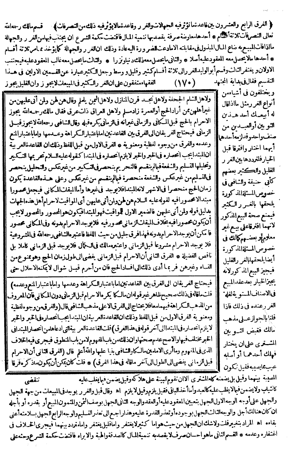 الْفَرْقُ الرَّابِعُ وَالْعِشْرُونَ بَيْنَ قَاعِدَةِ مَا تُؤَثِّرُ فِيهِ الْجَهَالَاتُ وَالْغَرَرُ وَقَاعِدَةِ مَا لَا يُؤَثِّرُ فِيهِ ذَلِكَ مِنْ التَّصَرُّفَاتِ) قَسَّمَ مَالِكٌ - رَحِمَهُ اللَّهُ تَعَالَى - التَّصَرُّفَاتِ ثَلَاثَةَ أَقْسَامٍ: أَحَدُهَا مُعَاوَضَةٌ صِرْفَةٌ يُقْصَدُ بِهَا تَنْمِيَةُ الْمَالِ فَاقْتَضَتْ حِكْمَةُ الشَّرْعِ أَنْ يُجْتَنَبَ فِيهَا مِنْ الْغَرَرِ وَالْجَهَالَةِ مَا إذَا فَاتَ الْمَبِيعُ بِهِ ضَاعَ الْمَالُ الْمَبْذُولُ فِي مُقَابَلَتِهِ إلَّا مَا دَعَتْ الضَّرُورَةُ إلَيْهِ عَادَةً وَذَلِكَ أَنَّ الْغَرَرَ وَالْجَهَالَةَ كَمَا يُؤْخَذُ مِمَّا مَرَّ ثَلَاثَةُ أَقْسَامٍ أَحَدُهَا مَا لَا يَحْصُلُ مَعَهُ الْمَعْقُودُ عَلَيْهِ أَصْلًا وَالثَّانِي مَا يَحْصُلُ مَعَهُ ذَلِكَ دَنِيًّا وَنَزْرًا وَالثَّالِثُ مَا يَحْصُلُ مَعَهُ غَالِبُ الْمَعْقُودِ عَلَيْهِ فَيُجْتَنَبُ الْأَوَّلَانِ وَيُغْتَفَرُ الثَّالِثُ.