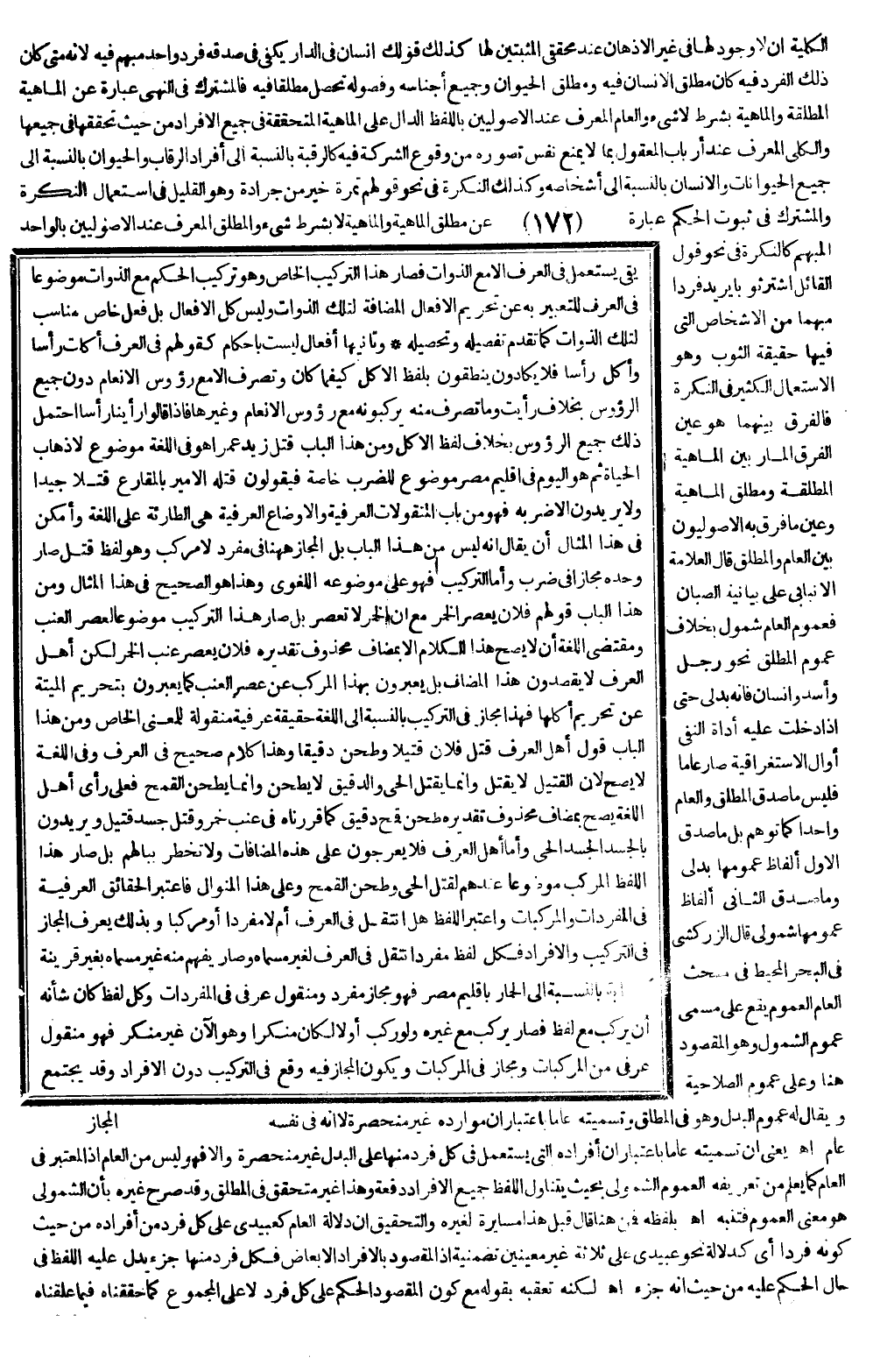 ـــــــــــــــــــــــــــــQالْكُلِّيَّةِ أَنْ لَا وُجُودَ لَهَا فِي غَيْرِ الْأَذْهَانِ عِنْدَ مُحَقِّقِي الْمُثْبِتِينَ لَهَا كَذَلِكَ قَوْلُك إنْسَانٌ فِي الدَّارِ يَكْفِي فِي صِدْقِهِ فَرْدٌ وَاحِدٌ مُبْهَمٌ فِيهِ لِأَنَّهُ مَتَى كَانَ ذَلِكَ الْفَرْدُ فِيهِ كَانَ مُطْلَقُ الْإِنْسَانِ فِيهِ وَمُطْلَقُ الْحَيَوَانِ وَجَمِيعُ أَجْنَاسِهِ وَفُصُولِهِ تَحْصُلُ مُطْلَقًا فِيهِ فَالْمُشْتَرَكُ فِي النَّهْيِ عِبَارَةٌ عَنْ الْمَاهِيَّةِ الْمُطْلَقَةِ وَالْمَاهِيَّةُ بِشَرْطِ لَا شَيْءَ وَالْعَامُّ الْمُعَرِّفُ عِنْدَ الْأُصُولِيِّينَ بِاللَّفْظِ الدَّالِّ عَلَى الْمَاهِيَّةِ الْمُتَحَقِّقَةِ فِي جَمِيعِ الْأَفْرَادِ مِنْ حَيْثُ تَحَقُّقُهَا فِي جَمِيعِهَا وَالْكُلِّيُّ الْمُعَرِّفُ عِنْدَ أَرْبَابِ الْمَعْقُولِ بِمَا لَا يَمْنَعُ نَفْسَ تَصَوُّرِهِ مِنْ وُقُوعِ الشَّرِكَةِ فِيهِ كَالرَّقَبَةِ بِالنِّسْبَةِ إلَى أَفْرَادِ الرِّقَابِ وَالْحَيَوَانِ بِالنِّسْبَةِ إلَى جَمِيعِ الْحَيَوَانَاتِ وَالْإِنْسَانِ بِالنِّسْبَةِ إلَى أَشْخَاصِهِ وَكَذَلِكَ النَّكِرَةُ فِي نَحْوِ قَوْلِهِمْ تَمْرَةٌ خَيْرٌ مِنْ جَرَادَةٍ وَهُوَ الْقَلِيلُ فِي اسْتِعْمَالِ النَّكِرَةِ وَالْمُشْتَرَكُ فِي ثُبُوتِ الْحُكْمِ عِبَارَةٌ عَنْ مُطْلَقِ الْمَاهِيَّةِ وَالْمَاهِيَّةُ لَا بِشَرْطِ شَيْءٍ وَالْمُطْلَقُ الْمُعَرَّفُ عِنْدَ الْأُصُولِيِّينَ بِالْوَاحِدِ الْمُبْهَمِ كَالنَّكِرَةِ فِي نَحْوِ قَوْلِ الْقَائِلِ اشْتَرِ ثَوْبًا يُرِيدُ فَرْدًا مُبْهَمًا مِنْ الْأَشْخَاصِ الَّتِي فِيهَا حَقِيقَةُ الثَّوْبِ وَهُوَ الِاسْتِعْمَالُ الْكَثِيرُ فِي النَّكِرَةِ فَالْفَرْقُ بَيْنَهُمَا هُوَ عَيْنُ الْفَرْقِ الْمَارِّ بَيْنَ الْمَاهِيَّةِ الْمُطْلَقَةِ وَمُطْلَقِ الْمَاهِيَّةِ.