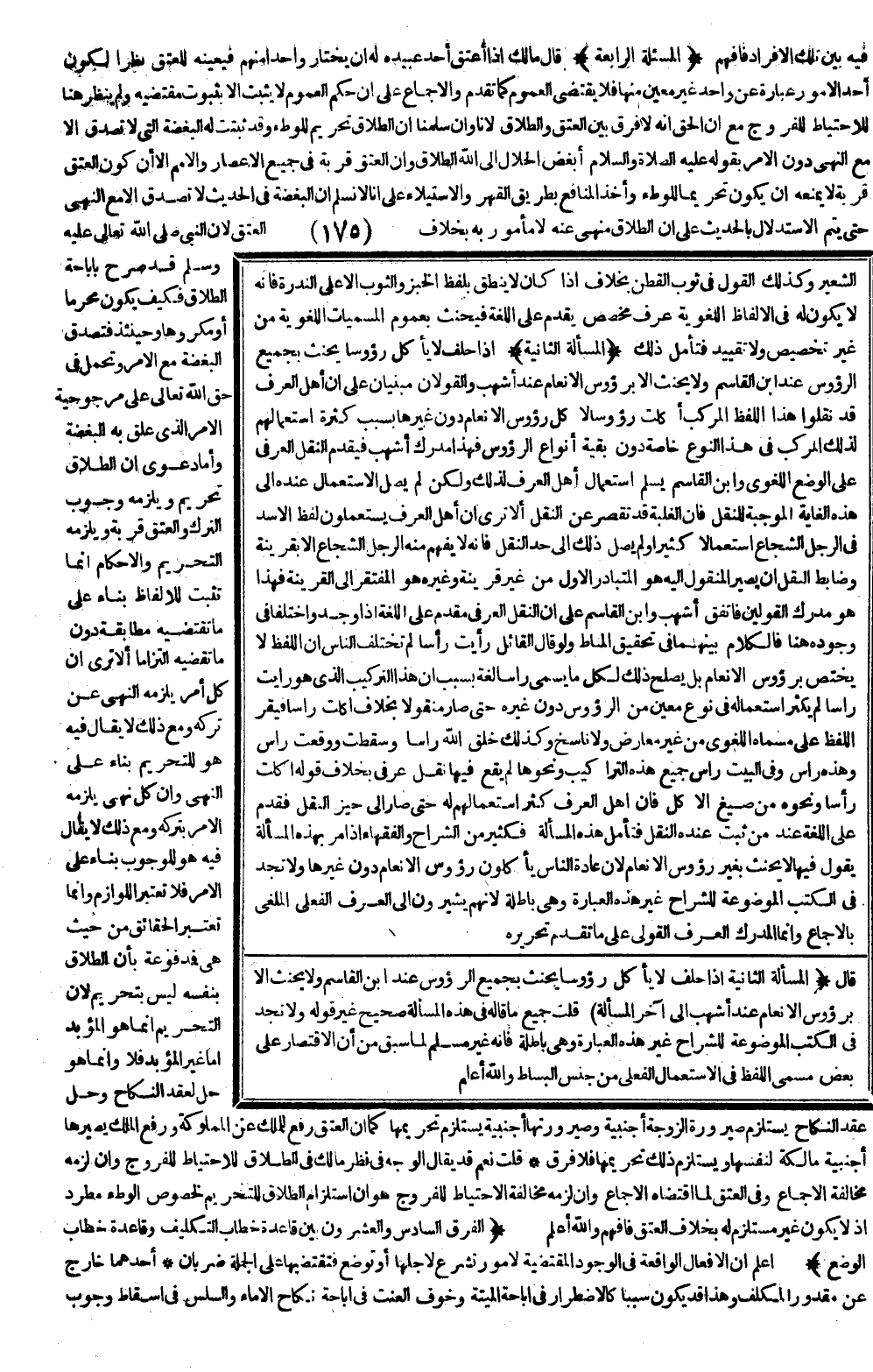 (الْمَسْأَلَةُ الرَّابِعَةُ) قَالَ مَالِكٌ إذَا أَعْتَقَ أَحَدَ عَبِيدِهِ لَهُ أَنْ يَخْتَارَ وَاحِدًا مِنْهُمْ فَيُعَيِّنُهُ لِلْعِتْقِ نَظَرًا لِكَوْنِ أَحَدِ الْأُمُورِ عِبَارَةً عَنْ وَاحِدٍ غَيْرِ مُعَيَّنٍ مِنْهَا فَلَا يَقْتَضِي الْعُمُومَ كَمَا تَقَدَّمَ وَالْإِجْمَاعُ عَلَى أَنَّ حُكْمَ الْعُمُومِ لَا يَثْبُتُ إلَّا بِثُبُوتِ مُقْتَضِيهِ وَلَمْ يُنْظَرْ هُنَا لِلِاحْتِيَاطِ لِلْفُرُوجِ مَعَ أَنَّ الْحَقَّ أَنَّهُ لَا فَرْقَ بَيْنَ الْعِتْقِ وَالطَّلَاقِ لِأَنَّا وَإِنْ سَلَّمْنَا أَنَّ الطَّلَاقَ تَحْرِيمٌ لِلْوَطْءِ وَقَدْ ثَبَتَ لَهُ الْبِغْضَةُ الَّتِي لَا تَصْدُقُ إلَّا مَعَ النَّهْيِ دُونَ الْأَمْرِ بِقَوْلِهِ - عَلَيْهِ الصَّلَاةُ وَالسَّلَامُ - «أَبْغَضُ الْحَلَالِ إلَى اللَّهِ الطَّلَاقُ» وَأَنَّ الْعِتْقَ قُرْبَةٌ فِي جَمِيعِ الْإِعْصَارِ وَالْأُمَمِ إلَّا أَنَّ كَوْنَ الْعِتْقِ قُرْبَةً لَا يَمْنَعُهُ أَنْ يَكُونَ تَحْرِيمًا لِلْوَطْءِ وَأَخْذِ الْمَنَافِعِ بِطَرِيقِ الْقَهْرِ وَالِاسْتِيلَاءِ عَلَى أَنَّا لَا نُسَلِّمُ أَنَّ الْبِغْضَةَ فِي الْحَدِيثِ لَا تَصْدُقُ إلَّا مَعَ النَّهْيِ حَتَّى يَتِمَّ الِاسْتِدْلَال بِالْحَدِيثِ عَلَى أَنَّ الطَّلَاقَ مَنْهِيٌّ عَنْهُ لَا مَأْمُورٌ بِهِ بِخِلَافِ الْعِتْقِ لِأَنَّ النَّبِيَّ - صَلَّى اللَّهُ تَعَالَى عَلَيْهِ وَسَلَّمَ - قَدْ صَرَّحَ بِإِبَاحَةِ الطَّلَاقِ فَكَيْفَ يَكُونُ مُحَرَّمًا أَوْ مَكْرُوهًا وَحِينَئِذٍ فَتَصْدُقُ الْبِغْضَةُ مَعَ الْأَمْرِ وَتُحْمَلُ فِي حَقِّ اللَّهِ تَعَالَى عَلَى مَرْجُوحِيَّةِ الْأَمْرِ الَّذِي عُلِّقَ بِهِ الْبِغْضَةُ وَأَمَّا دَعْوَى أَنَّ الطَّلَاقَ تَحْرِيمٌ وَيَلْزَمُهُ وُجُوبُ التَّرْكِ وَالْعِتْقَ قُرْبَةٌ وَيَلْزَمُهُ التَّحْرِيمُ وَالْأَحْكَامُ إنَّمَا تَثْبُتُ لِلْأَلْفَاظِ بِنَاءً عَلَى مَا تَقْتَضِيهِ مُطَابَقَةً دُونَ مَا تَقْتَضِيهِ الْتِزَامًا أَلَا تَرَى أَنَّ كُلَّ أَمْرٍ يَلْزَمُهُ النَّهْيُ عَنْ تَرْكِهِ وَمَعَ ذَلِكَ لَا يُقَالُ فِيهِ هُوَ لِلتَّحْرِيمِ بِنَاءً عَلَى النَّهْيِ وَأَنَّ كُلَّ نَهْيٍ يَلْزَمُهُ الْأَمْرُ بِتَرْكِهِ وَمَعَ ذَلِكَ لَا يُقَالُ فِيهِ هُوَ لِلْوُجُوبِ بِنَاءً عَلَى الْأَمْرِ فَلَا تُعْتَبَرُ اللَّوَازِمُ وَإِنَّمَا تُعْتَبَرُ الْحَقَائِقُ مِنْ حَيْثُ هِيَ فَمَدْفُوعَةٌ بِأَنَّ الطَّلَاقَ بِنَفْسِهِ لَيْسَ بِتَحْرِيمٍ لِأَنَّ التَّحْرِيمَ إنَّمَا هُوَ الْمُؤَبَّدُ أَمَّا غَيْرُ الْمُؤَبَّدِ فَلَا.